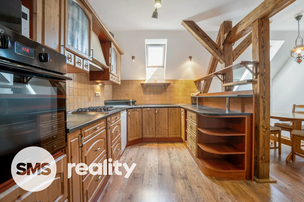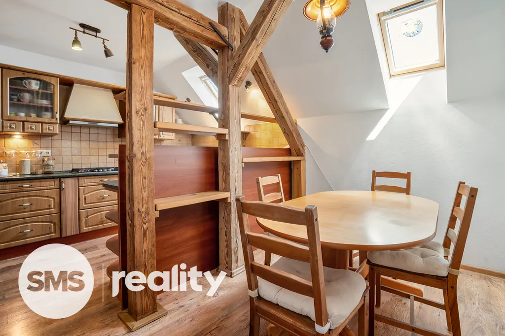 Dispozice bytu je následující: neprůchozí pokoj, obývák se vstupem do ložnice, kuchyni s jídelním koutem, koupelnu, samostatné WC a prostornou vstupní chodbu. Kuchyně je plně vybavená plynovým sporákem, elektrickou troubou, myčkou nádobí a digestoří s filtrem, přičemž v prostoru je dostatek světla díky střešním oknům. Na chodbě náleží k bytu prostorná komora, pro skladování věcí.