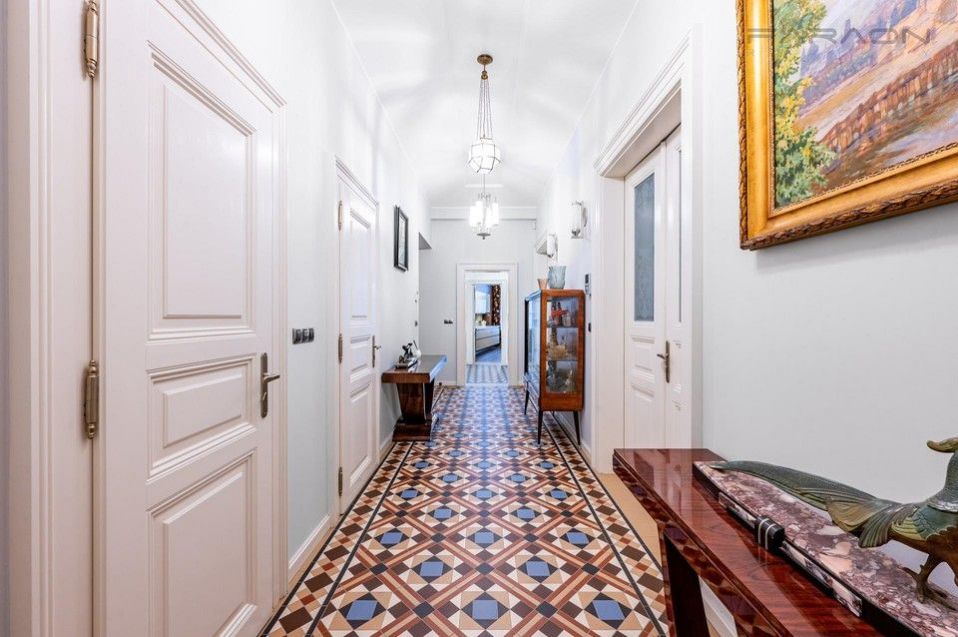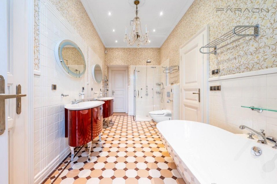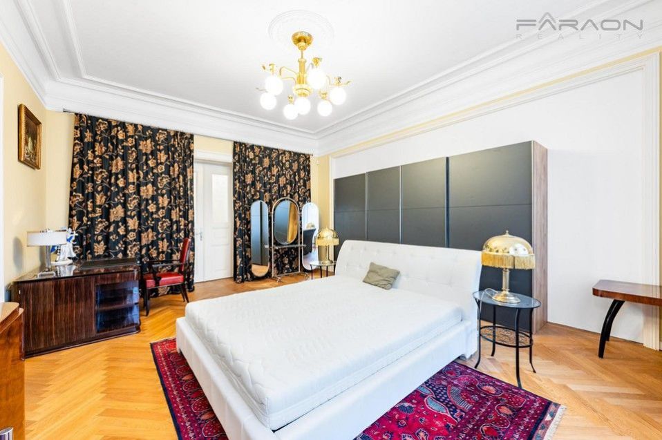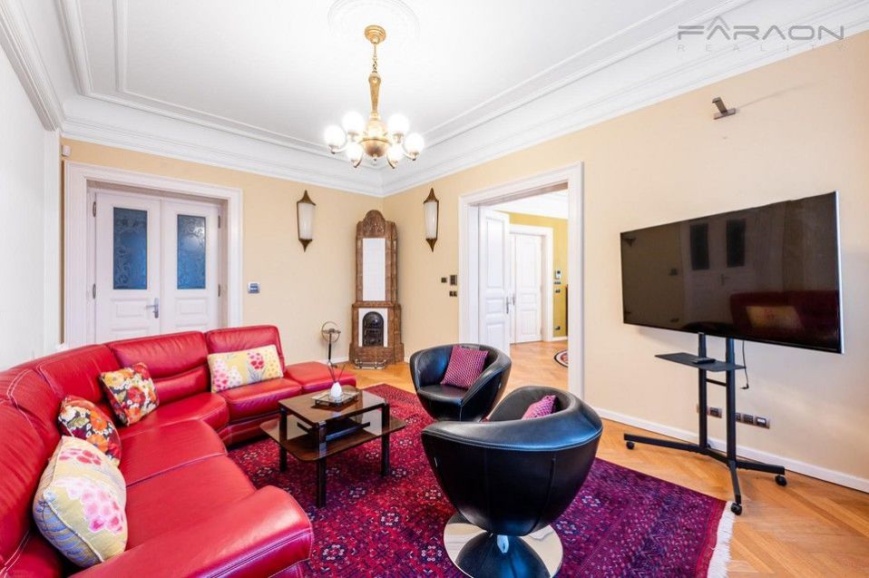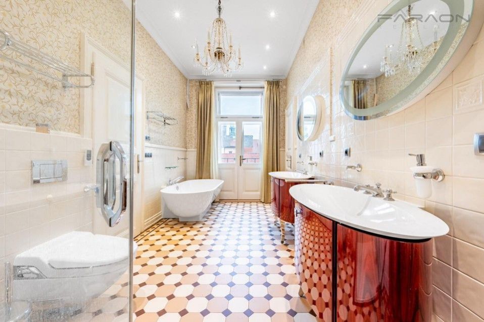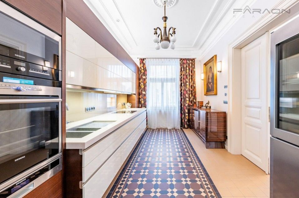 Nabízíme pronájem nádherného zařízeného luxusního bytu 4+1, 184 m2 v těsné blízkosti Staroměstského náměstí a Židovského hřbitova. Byt po mimořádně zdařilé komplexní rekonstrukci je situován ve 4. patře secesního domu s designovým výtahem. Je zařízen původním historickým nábytkem a disponuje ložnicí, pracovnou, obývacím pokojem, jídelnou, plně vybavenou prostornou kuchyní, luxusní koupelnou, vstupní halou, technickou a úložnou komorou, WC pro hosty a dvěmi balkony. Kvalitní kuchyňské spotřebiče, pračka a sušička, TV, domácí kino a satelitní připojení. V koupelně nechybí solitérní vana, masážní sprchový kout a WC. Originální architektonické prvky v bytě dále umocňují vysoké stropy, velká okna, repasovaná kachlová kamna a designová původní svítidla. Dubové parkety a dekorativní dlažba na podlaze. Vstupní bezpečnostní dveře, alarm, videotelefon. Podlahové topení s plynovým etážovým kotlem zn. Viessmann.
