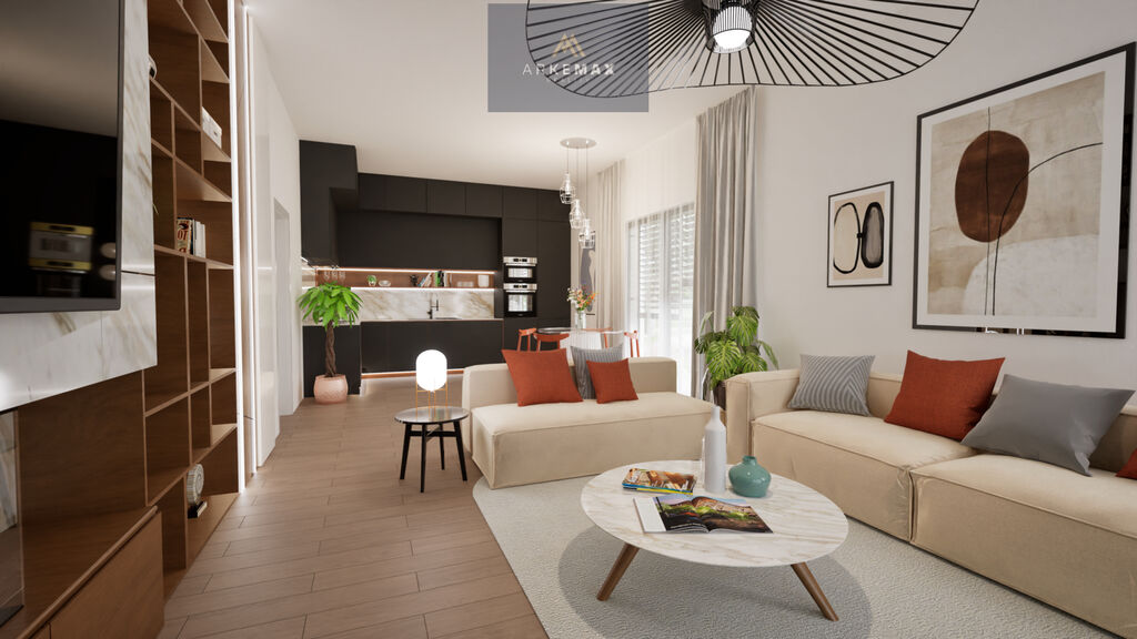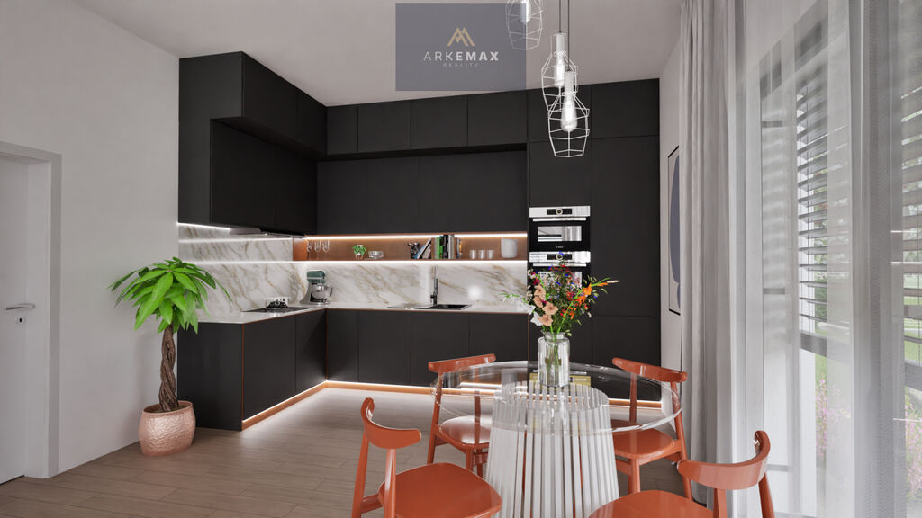 V přízemí se z chodby dostanete do obývacího pokoje spojený s kuchyňskou linkou s výměrou 36 m2. Dostatek místa, kde si rodinnou pohodu užijete po celý rok. V zimě vás bude hřát podlahové vytápění a v létě stačí otevřít velké dveře a celý prostor propojit se zahradou. Z chodby se dále dostanete do samostatného pokoje, ze kterého může být pracovna nebo třeba ložnice pro hosty. Koupelna v přízemí je vybavena vanou a WC.