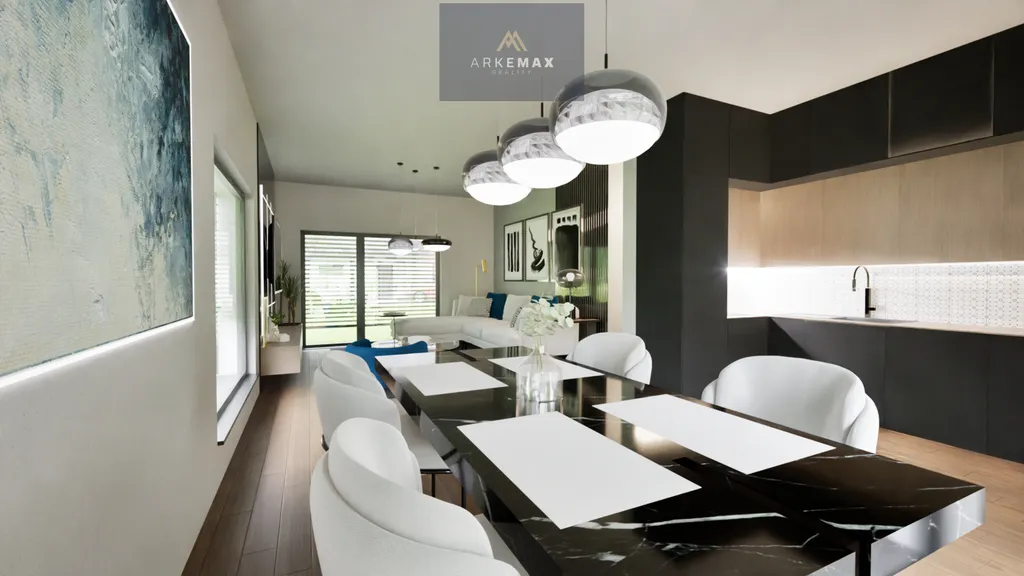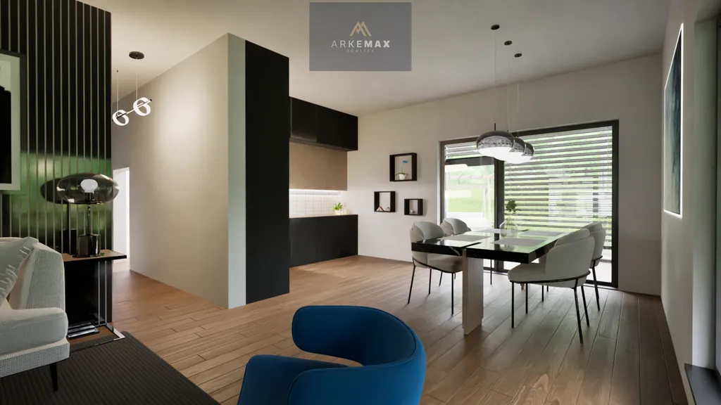 Přízemí domu bude tvořeno vstupní chodbou přecházející do otevřeného obývacího pokoje s kuchyní, jídelní zóna a