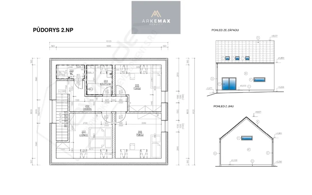 druhém podlaží se nachází ložnice, dva pokoje a druhá koupelna s toaletou. Dům disponuje také zastřešeným