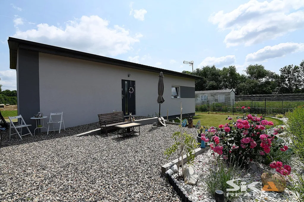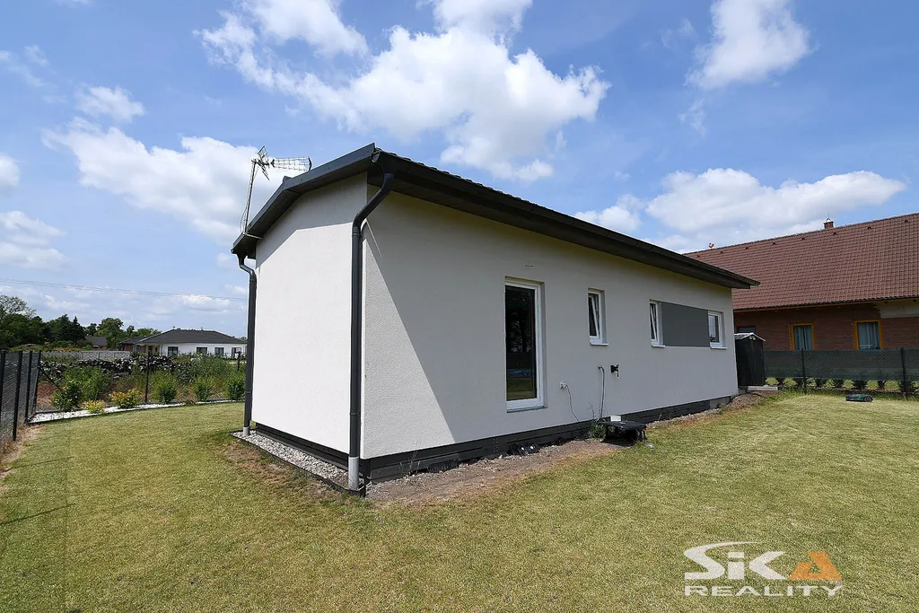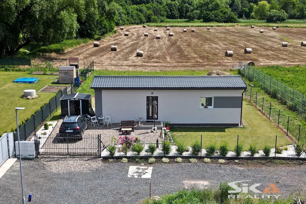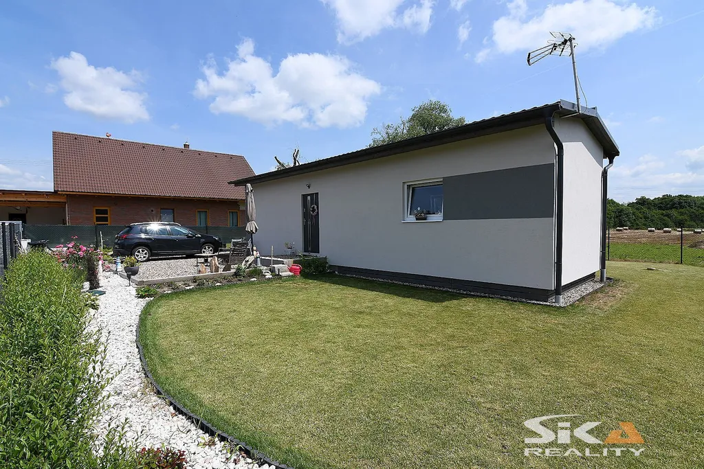 Nabízíme exkluzivně k prodeji novostavbu domu, která je postavena na pozemku obdélníkového půdorysu o celkové zapsané výměře 892 m2 nacházející se v okrajové části obce Cítoliby u Loun. Stavba domu je situována u západní hranice pozemku, má zastavěnou plochu 51 m2, dispoziční řešení 2+kk a celkovou podlahovou plochu cca 40m2. Jedná se o montovanou stavbu typového modulového domu „Český dům“, umístěnou na betonových patkách, která má zřízeny přípojky elektrické energie, obecního vodovodu a kanalizace (přetlaková). Dům má sedlovou střechu, plastová okna s izolačními trojskly s vnitřními zatemňovacími roletami, vytápění objektu je zajištěno stropními topnými fóliemi Heatflow s oddělenou regulací pro každou místnost, v koupelně instalován topný žebřík, ohřev teplé užitkové vody elektrickým bojlerem. Na podlahách vinylová krytina, obložkové zárubně, kuchyňská linka do tvaru písmene „U“ s vestavěnými spotřebiči – elektrická trouba, myčka, digestoř, samostatně stojící indukční varná deska. Dům je umístěn v klidné rezidenční okrajové části obce s množstvím zeleně. Městys Cítoliby se nachází přibližně 3 km od centra města Louny. V obci je základní občanská vybavenost jako mateřská a základní škola, obchod, lékař. Výborné dopravní napojení na dálnici D7. Vzhledem ke skutečnosti, že nebyl předložen PENB, uvádíme třídu energetické náročnosti „G“. Další informace rádi poskytneme v RK.