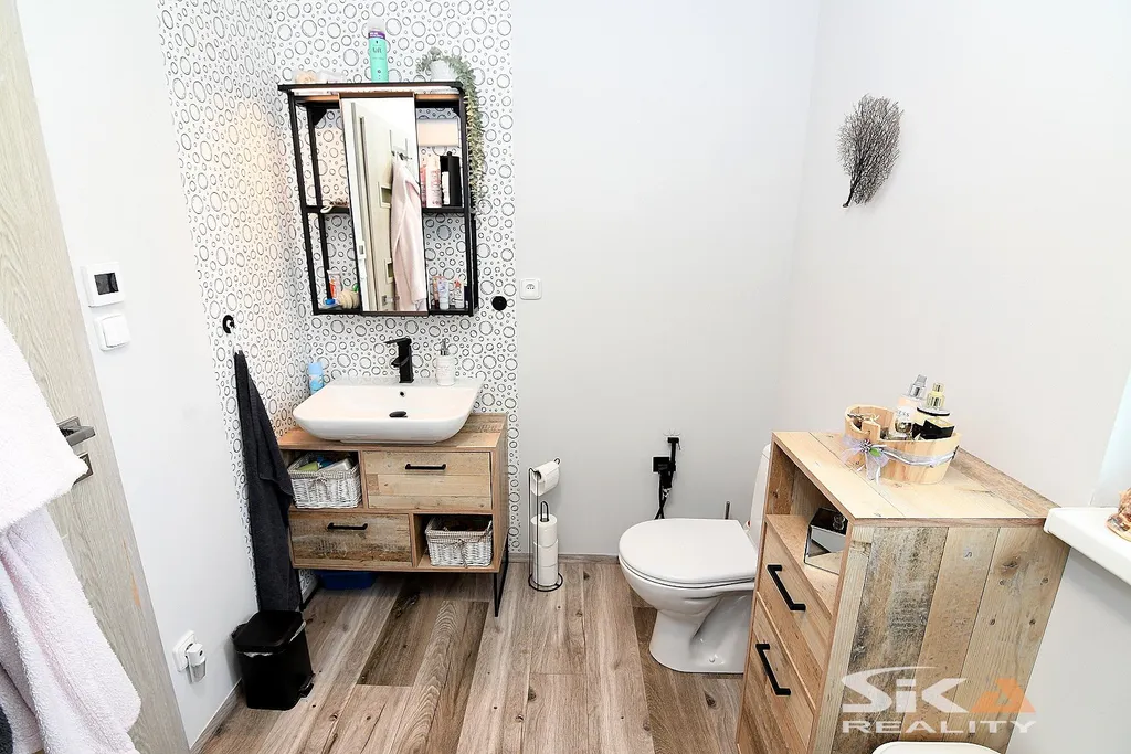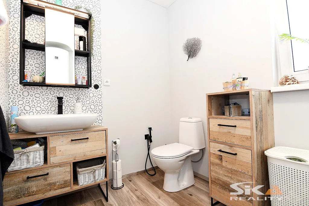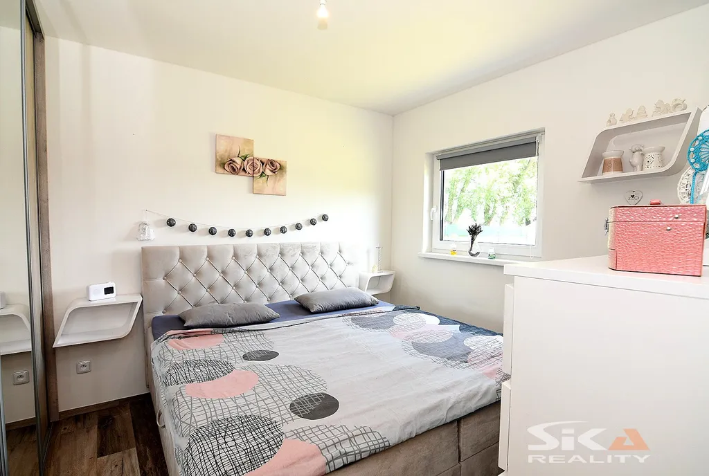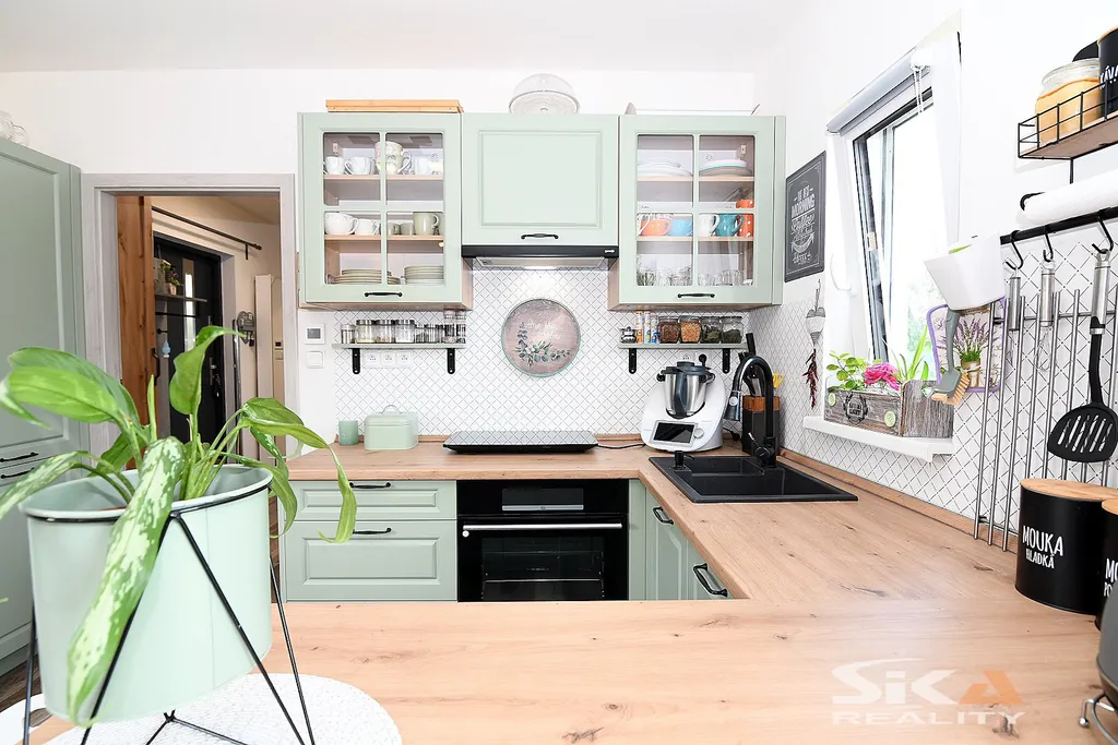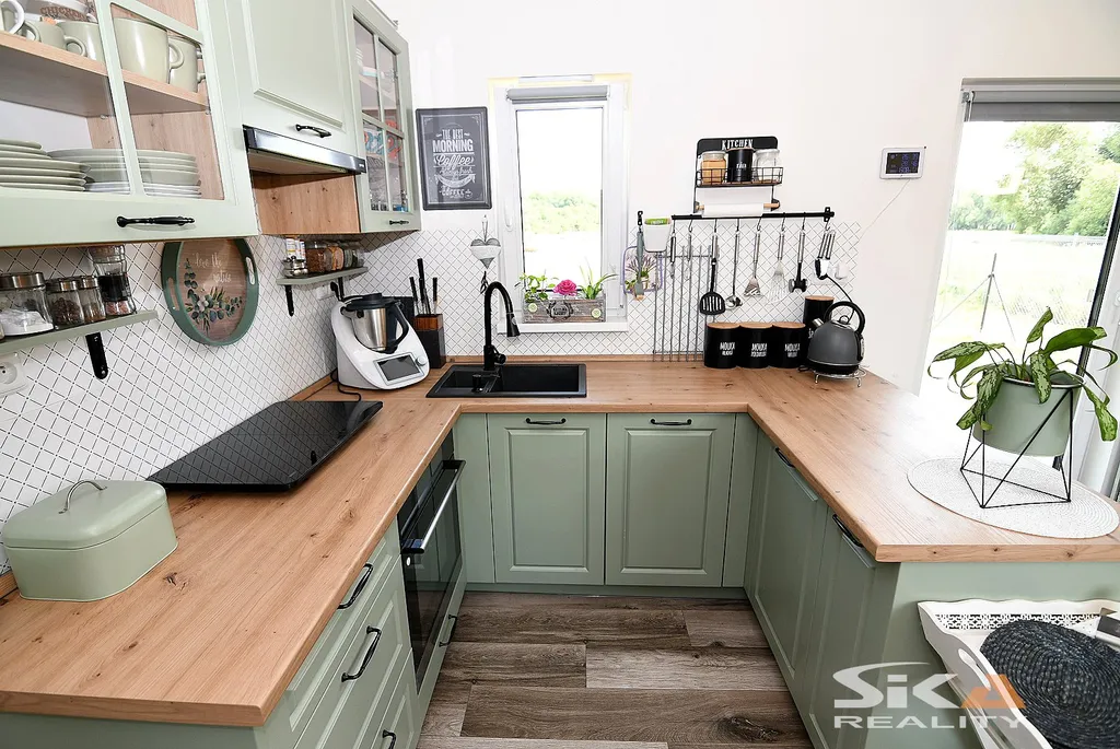 Nabízíme exkluzivně k prodeji novostavbu domu, která je postavena na pozemku obdélníkového půdorysu o celkové zapsané výměře 892 m2 nacházející se v okrajové části obce Cítoliby u Loun. Stavba domu je situována u západní hranice pozemku, má zastavěnou plochu 51 m2, dispoziční řešení 2+kk a celkovou podlahovou plochu cca 40m2. Jedná se o montovanou stavbu typového modulového domu „Český dům“, umístěnou na betonových patkách, která má zřízeny přípojky elektrické energie, obecního vodovodu a kanalizace (přetlaková). Dům má sedlovou střechu, plastová okna s izolačními trojskly s vnitřními zatemňovacími roletami, vytápění objektu je zajištěno stropními topnými fóliemi Heatflow s oddělenou regulací pro každou místnost, v koupelně instalován topný žebřík, ohřev teplé užitkové vody elektrickým bojlerem. Na podlahách vinylová krytina, obložkové zárubně, kuchyňská linka do tvaru písmene „U“ s vestavěnými spotřebiči – elektrická trouba, myčka, digestoř, samostatně stojící indukční varná deska. Dům je umístěn v klidné rezidenční okrajové části obce s množstvím zeleně. Městys Cítoliby se nachází přibližně 3 km od centra města Louny. V obci je základní občanská vybavenost jako mateřská a základní škola, obchod, lékař. Výborné dopravní napojení na dálnici D7. Vzhledem ke skutečnosti, že nebyl předložen PENB, uvádíme třídu energetické náročnosti „G“. Další informace rádi poskytneme v RK.