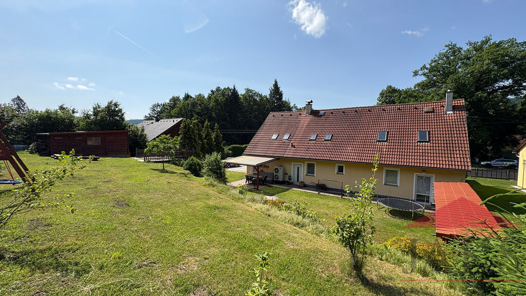 Hlavní výhodou této nemovitosti je velký „životní prostor“, jak v obytné části, kde dominuje otevřený obývací pokoj 64 m2 s kuchyní a terasou, samostatný apartmán 1+kk 82 m2 (lze pronajímat pomocí Airnb či užívat jako klasický výminek díky bezbariérovému přístupu), tak velká slunná, schovaná zahrada, zaručující dostatek soukromí a přímý vstup do lesa! Další nespornou výhodou je dvojí topení, buď ekonomické na dřevo anebo pohodlné TČ a skvělá poloha s krátkým dojezdem do Sušice a blízkostí řeky Otavy s oblázkovou pláží „Páteček“.