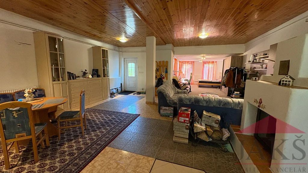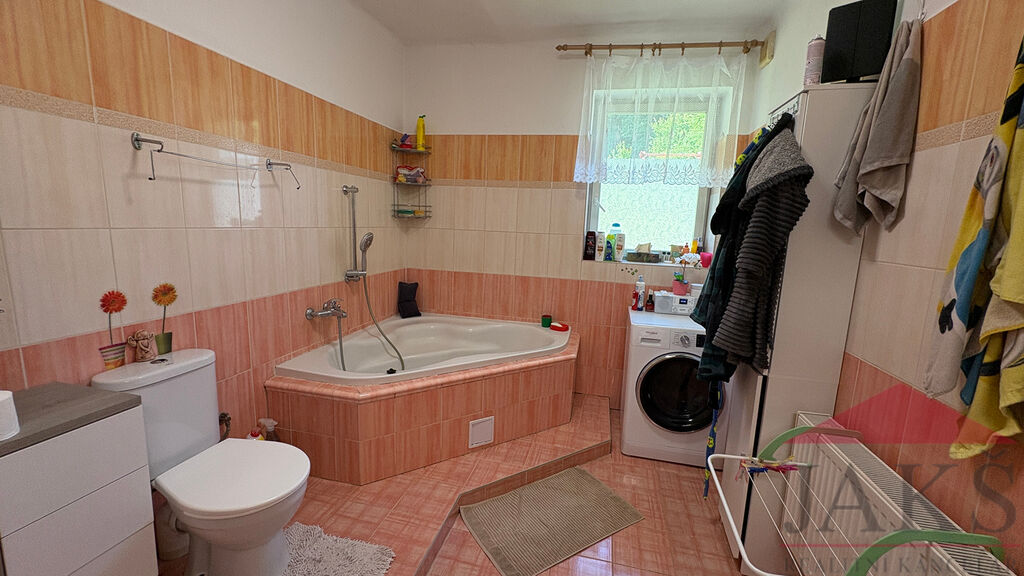 Popis: přízemí: apartmán/výminek 82 m2: otevřený prostor obývacího pokoje s krbem, kuch. koutem (kuch. linka s HV troubou se sklo-ker. deskou, digestoří a pračkou) a vstupem na zahradu, koupelna (masážní sprch. kout, umyv. se zrcadlem, WC); 5+kk (188 m2) s terasou: předsíň, prostorný obývací pokoj 64 m2 s krbem, kuch. koutem (rohová kuch. linka s vest. spotřebiči: HV trouba, MV trouba, sklo-ker. deska a myčka) se schodištěm a vstupem na zastřešenou terasu (4 x 4 m; dřevo-plast), koupelna (rohová vana, umyv. se skříňkou a zrcadlem, WC, vývody na pračku), podkroví: chodba, koupelna (umyv. se zrcadlem, WC, možnost obnovení sprchy), 4x ložnice s šatnou, 2x pracovna (malé pokoje do 10 m2) s šatnou a 2x komora/sklad; nízká půdička.