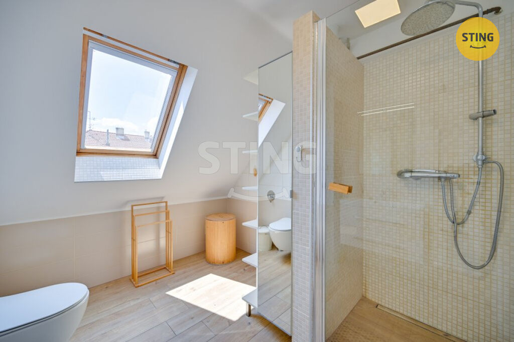 Byt prošel téměř kompletní rekonstrukcí. Disponuje šatnou, koupelnou s toaletou a dalším samostatným WC. K vybavení patří moderní kuchyň, značková střešní okna, bezpečnostní dveře a podlahy z korku a dlažba. Úložný prostor doplňuje sklep (12 m²).