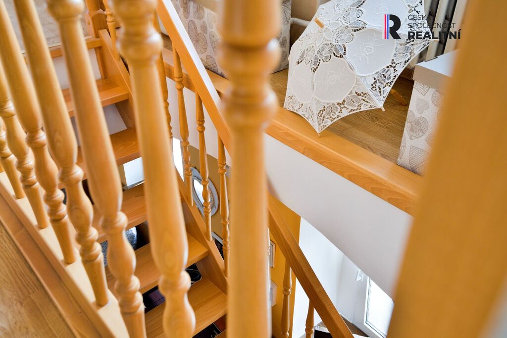 Ve druhém patře je jednotka 100m2, o upravené dispozici na 3+1 pro rodinu s dětmi. Disponuje samostatnou velkou kuchyní, koupelnou a třemi pokoji. Opět jsou zde k dispozici krbová kamna a celý byt má velmi příjemnou orientaci.