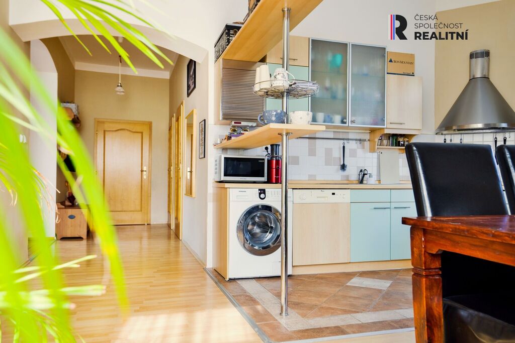 Ve čtvrtém podlaží je půdní prostor, který byl upraven na bytovou jednotku 3+kk o výměře 90m2. Zde je koupelna se sprchovým koutem a WC, střešní okna v každé z místností.