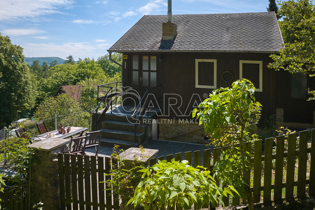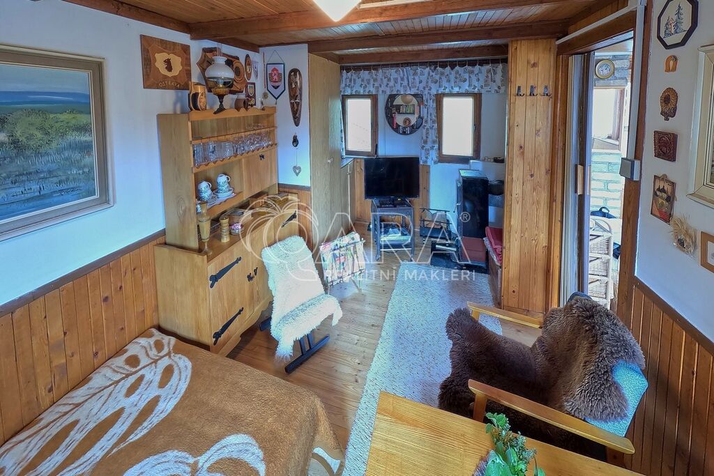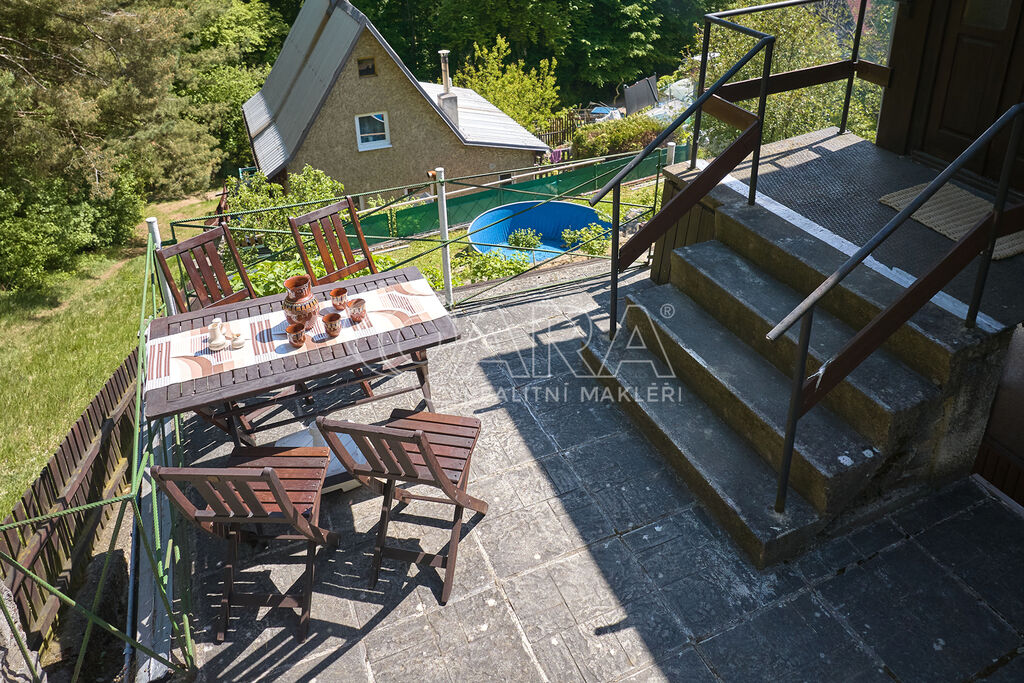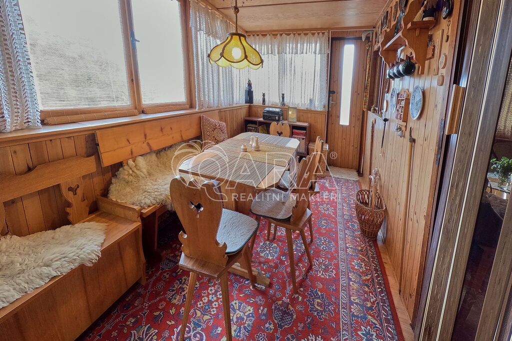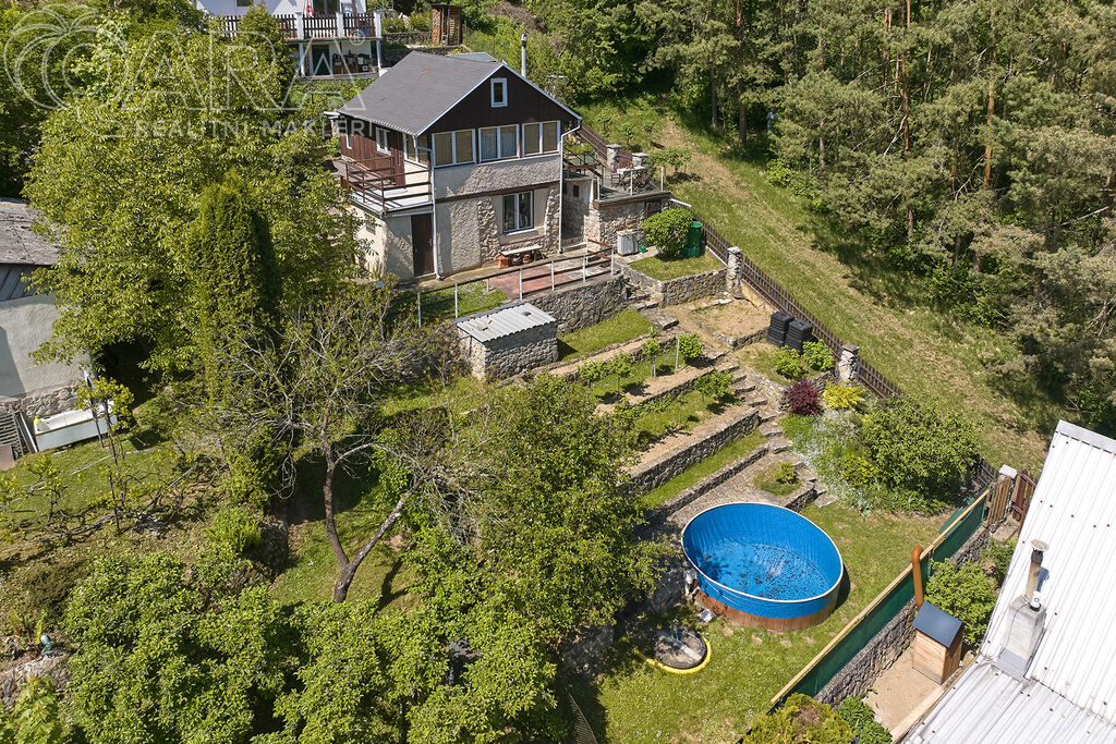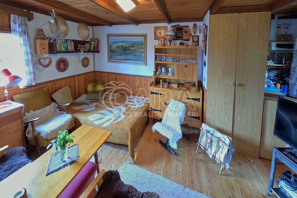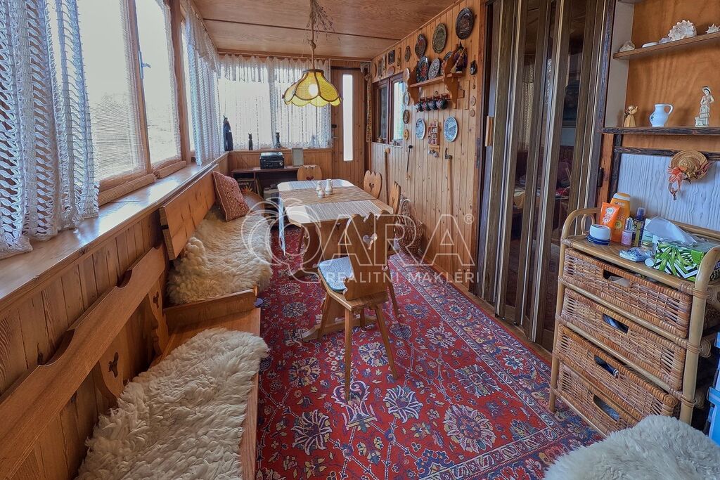 Slunný pozemek o velikosti 346 m2 je svažitý, tvořený několika uměle vyrobenými terasami, a budova chaty je do tohoto svahu vsazena. Spodní část budovy je zděná a nalézá se tu kuchyně a koupelna se samostatnými vstupy zvenku. V dalším již dřevěném podlaží se nachází dva pokoje s výhledem na východ a navazující jižní terasou. Dřevo je použito také uvnitř. Nový majitel může využít půdní prostory k rozšíření obytného prostoru. K dispozici je také sklípek a kůlna či spíše dílna s nářadím. Suchý záchod je zabudovaný do svahu.