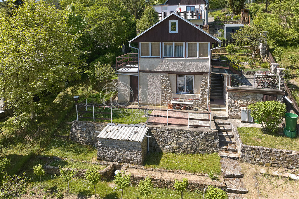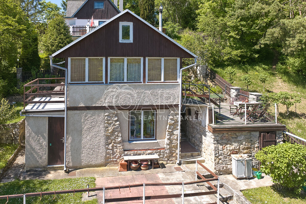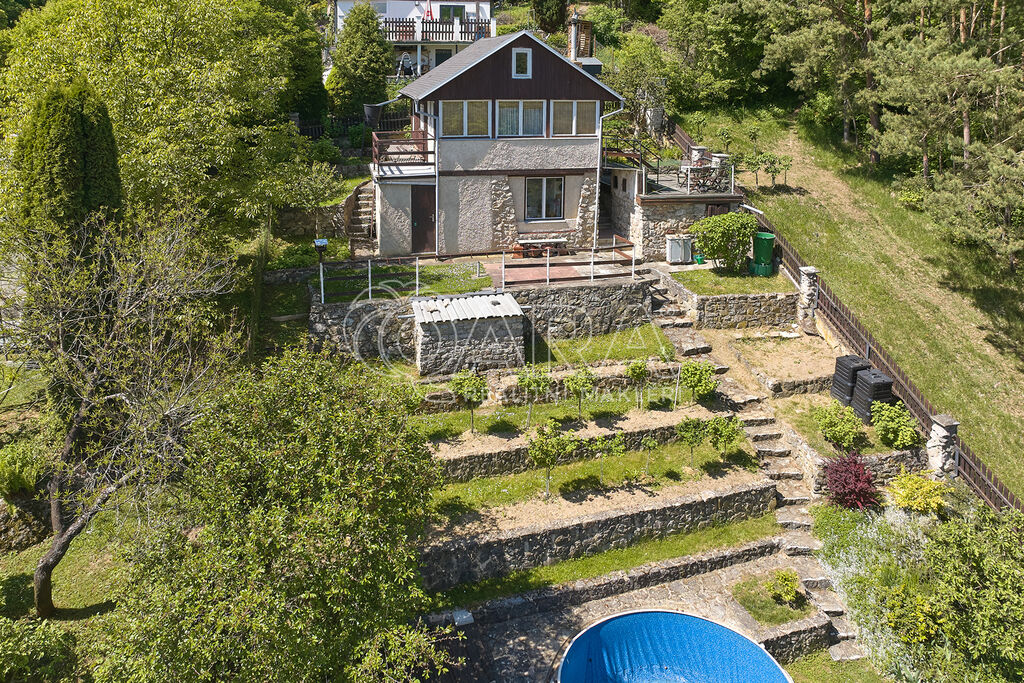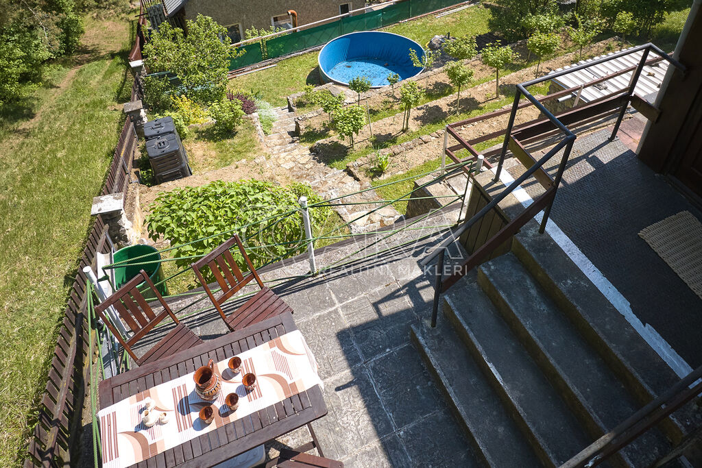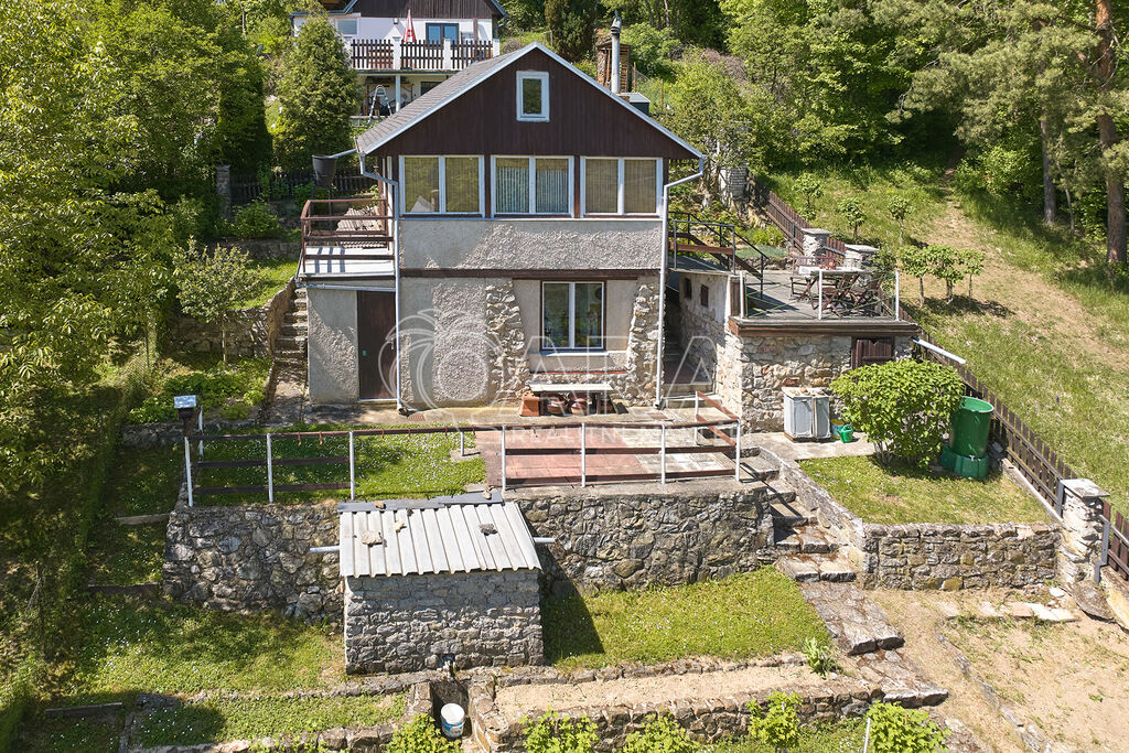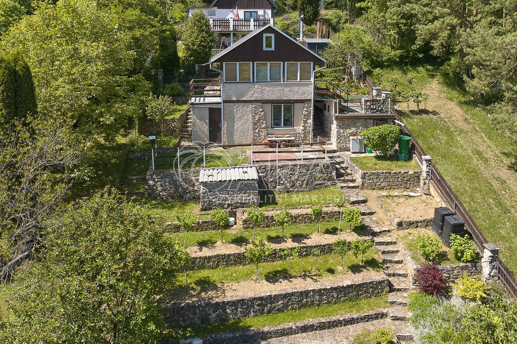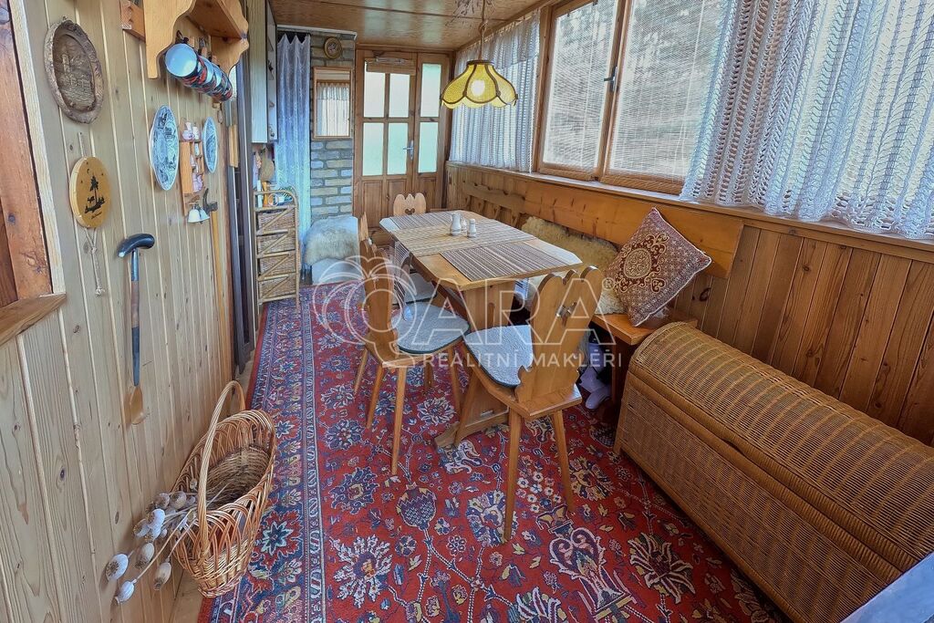 Slunný pozemek o velikosti 346 m2 je svažitý, tvořený několika uměle vyrobenými terasami, a budova chaty je do tohoto svahu vsazena. Spodní část budovy je zděná a nalézá se tu kuchyně a koupelna se samostatnými vstupy zvenku. V dalším již dřevěném podlaží se nachází dva pokoje s výhledem na východ a navazující jižní terasou. Dřevo je použito také uvnitř. Nový majitel může využít půdní prostory k rozšíření obytného prostoru. K dispozici je také sklípek a kůlna či spíše dílna s nářadím. Suchý záchod je zabudovaný do svahu.