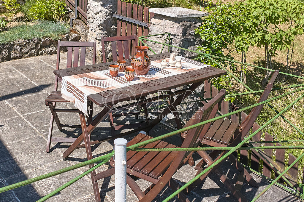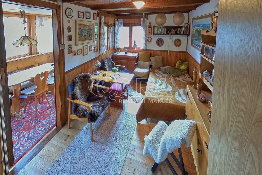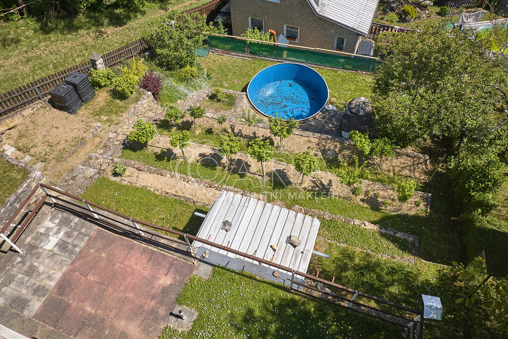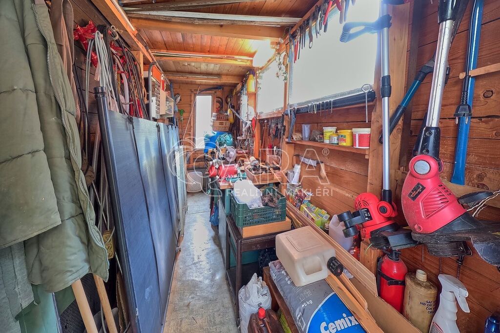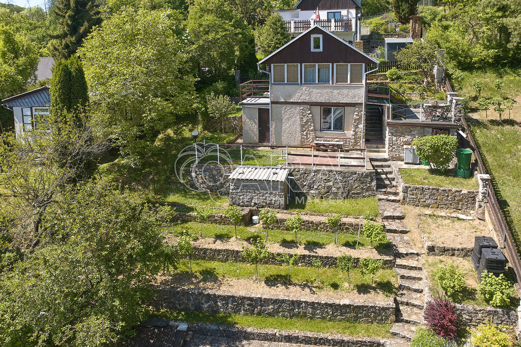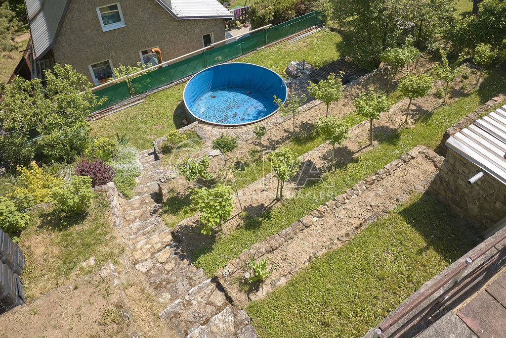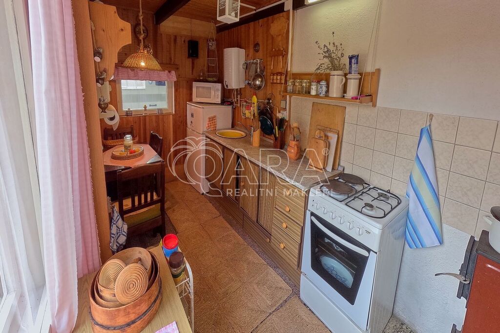 Slunný pozemek o velikosti 346 m2 je svažitý, tvořený několika uměle vyrobenými terasami, a budova chaty je do tohoto svahu vsazena. Spodní část budovy je zděná a nalézá se tu kuchyně a koupelna se samostatnými vstupy zvenku. V dalším již dřevěném podlaží se nachází dva pokoje s výhledem na východ a navazující jižní terasou. Dřevo je použito také uvnitř. Nový majitel může využít půdní prostory k rozšíření obytného prostoru. K dispozici je také sklípek a kůlna či spíše dílna s nářadím. Suchý záchod je zabudovaný do svahu.