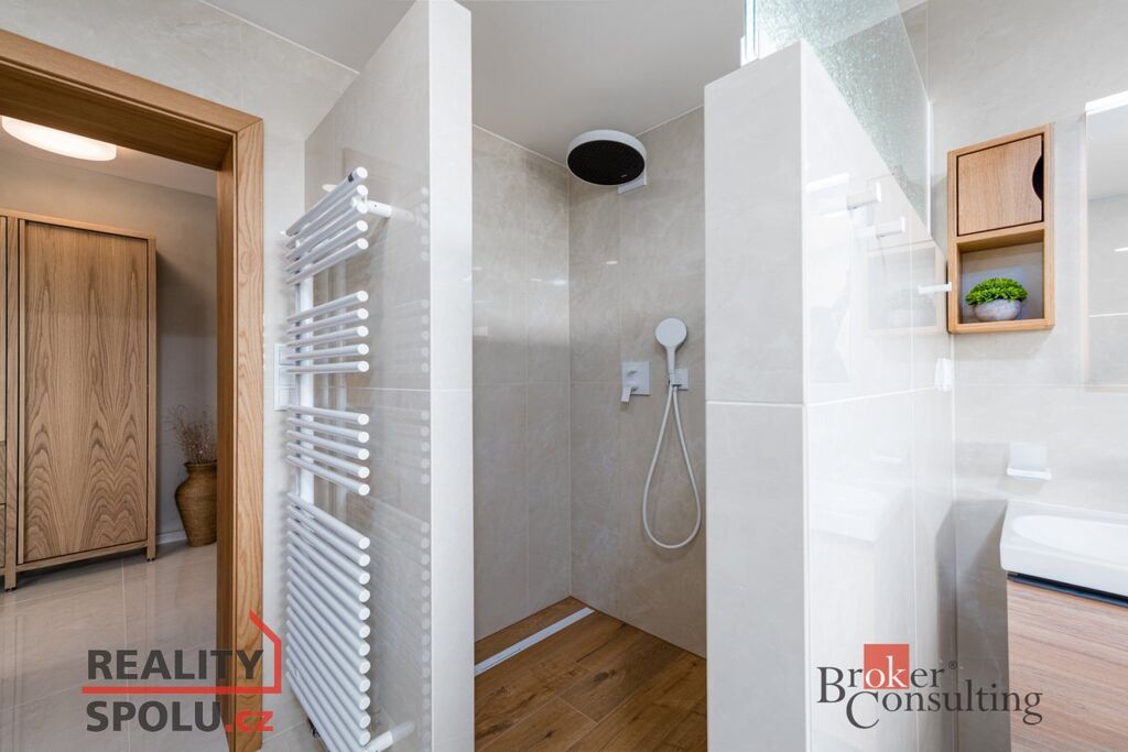 Jednotka o dispozici 3+kk ( 78 m² ) s prostornou šatnou je situována v posledním, pátém patře moderního domu a nabízí absolutní klid, soukromí a výjimečný standard bydlení. Největší dominantou je terasa o rozloze úchvatných 80 m², která obepíná celý byt a byla navržena jako soukromá relaxační zóna. Naleznete zde bioklimatickou pergolu, vířivku a vzrostlé stromy se samozavlažovacím systémem, které zajišťují maximální soukromí a navozují atmosféru luxusního apartmánu v přírodě. Každý vstup na terasu je tak malým únikem z města – do zeleně a ticha přilehlého parku.