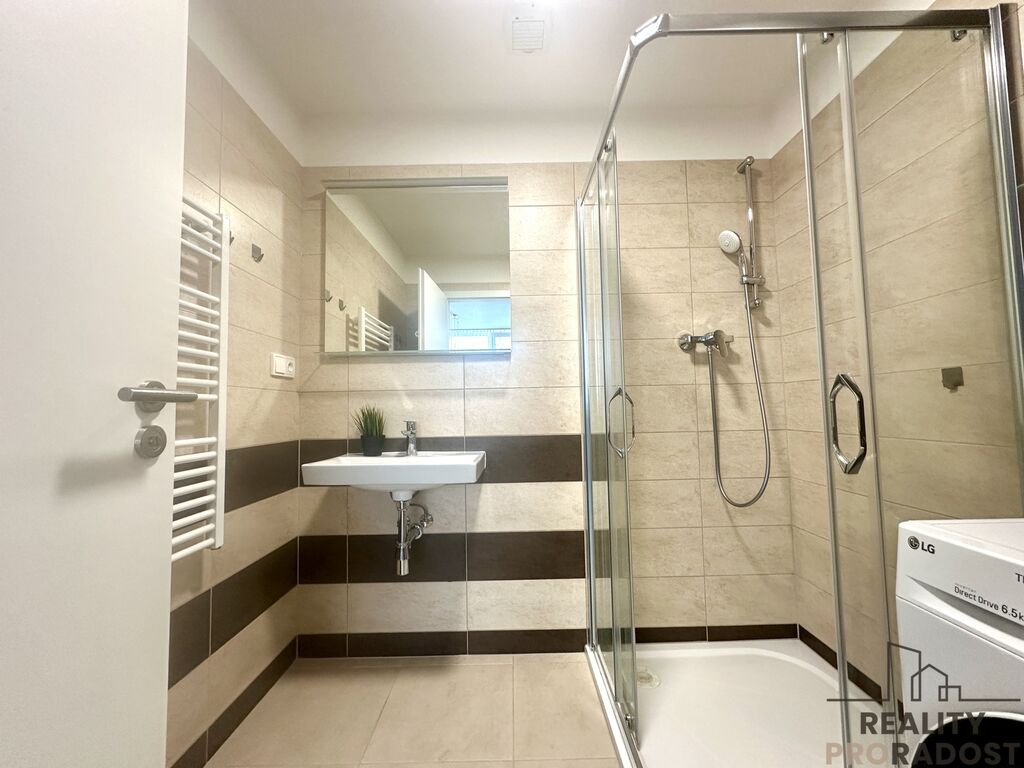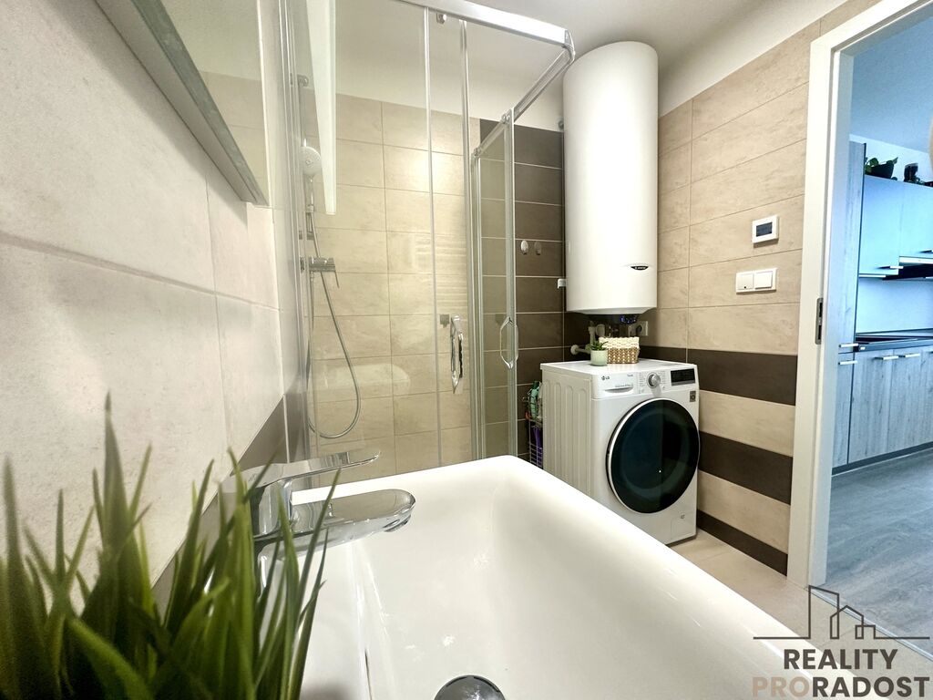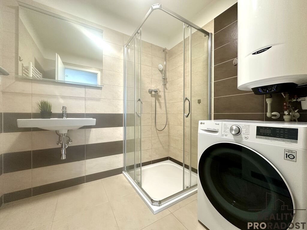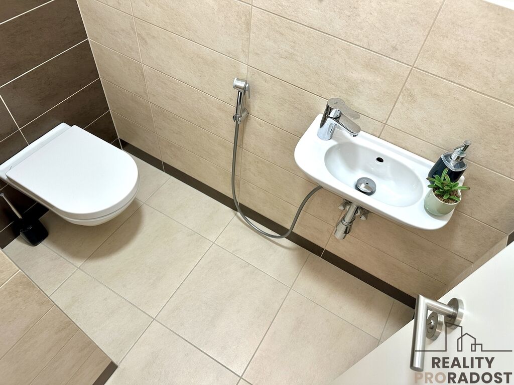Koupelna nabízí sprchový kout, umyvadlo, topný žebřík, bojler a přípojku na pračku. Toaleta je samostatná, vybavená i hygienickou sprškou.