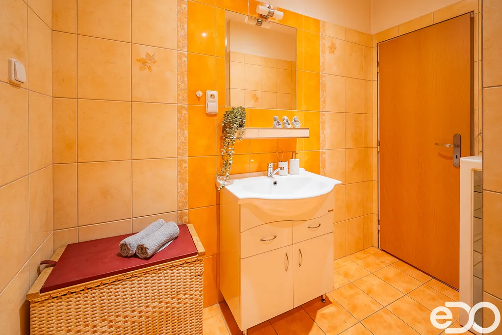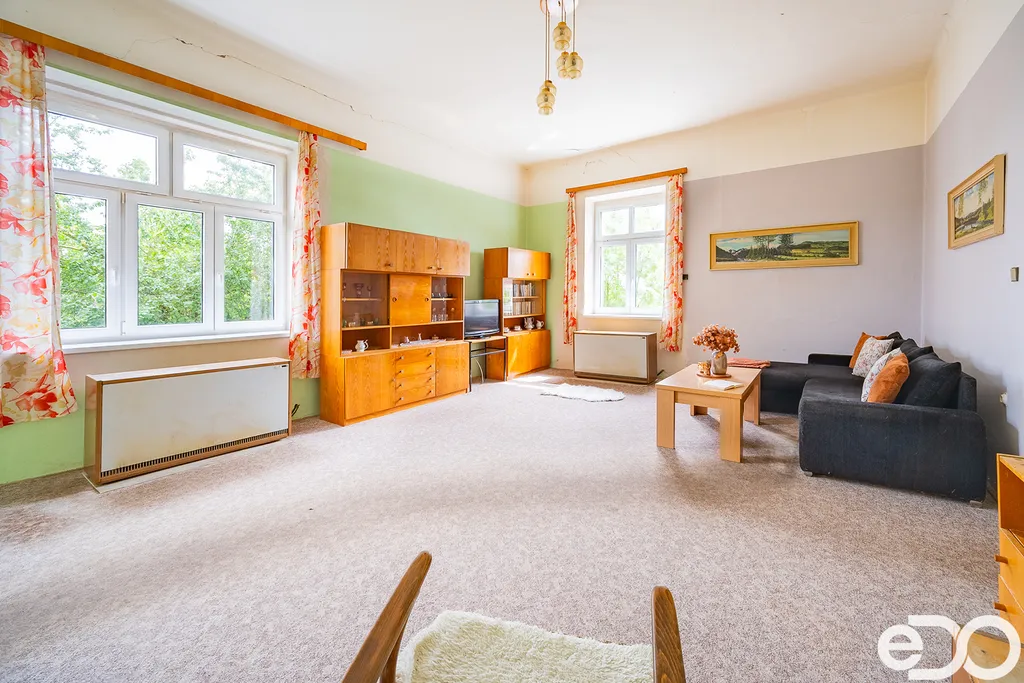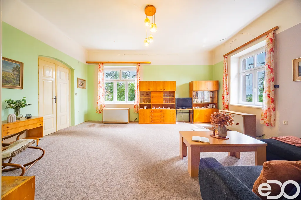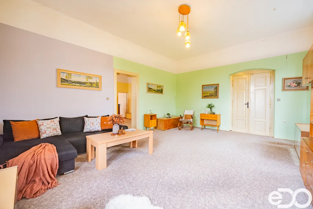 Byt má funkční a promyšlené uspořádání: z chodby vstupujete do koupelny s WC, do prostorné kuchyně s jídelním stolem a spíží, a také do velkého obývacího pokoje. Na ten navazuje ložnice a menší zadní pokoj – ideální jako pracovna, šatna nebo prostor pro domácí podnikání.