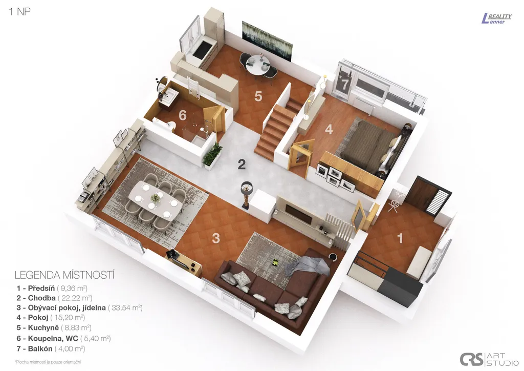 V přízemí domu: šatna (zádveří) 9,4 m2, chodba 6,6 m2, obývací pokoj 32,6 m2, ložnice 15,2 m2 + balkon 4 m2, koupelna s WC 5,4 m2.