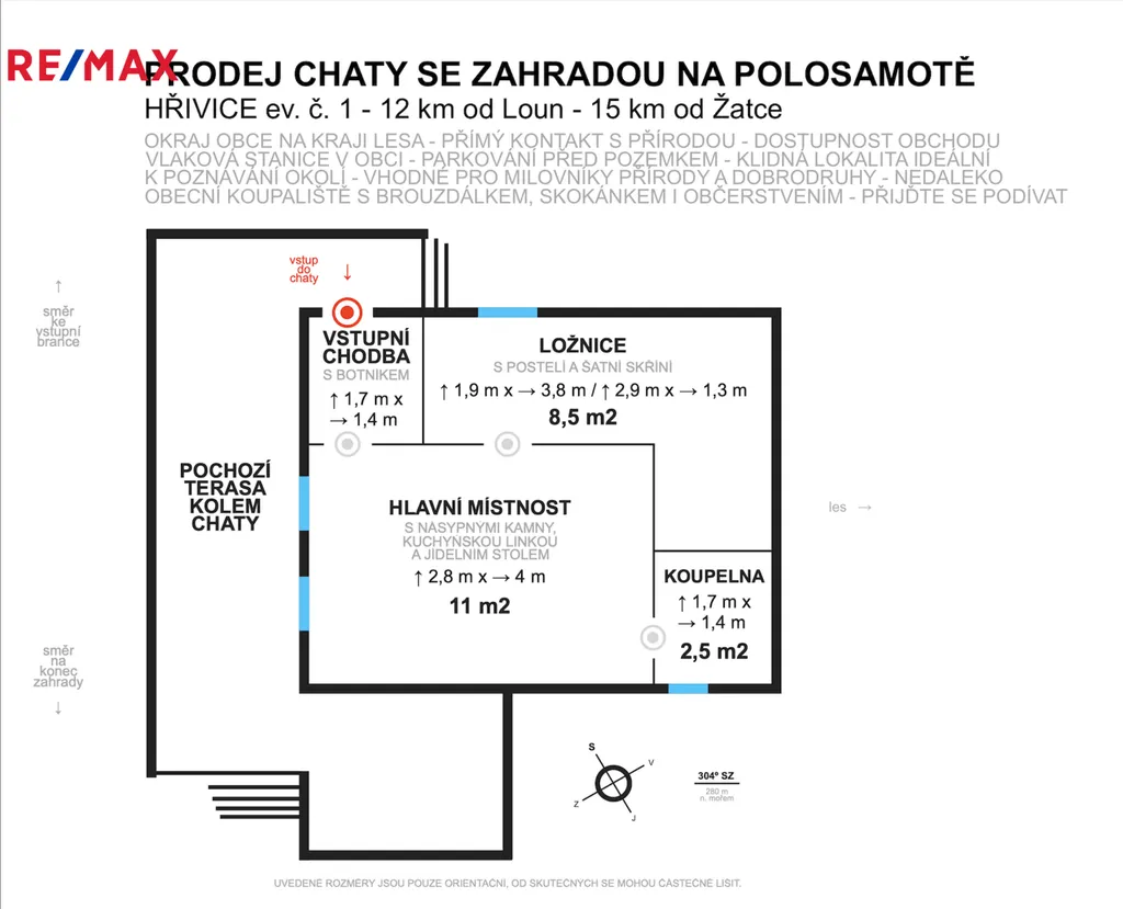 Samotná chata je udržovaná s novým nátěrem, prostornou verandou, nově zhotovenou elektřinou v mědi, masivními plechovými okenicemi a se zabudovaným elektronickým bezpečnostním systémem s napojením na policii. Tuto službu lze přenechat zdarma novým nabyvatelům. Přes vstupní chodbičkou vstoupíte do hlavní místnosti s okny do zahrady, kde jsou také umístěna výkonná kamna, v rohu je menší koupelna, posledním pokojem je samostatná ložnice pro 2 až 4 osoby. Detailní nákres včetně rozměrů naleznete v přiloženém půdorysu.