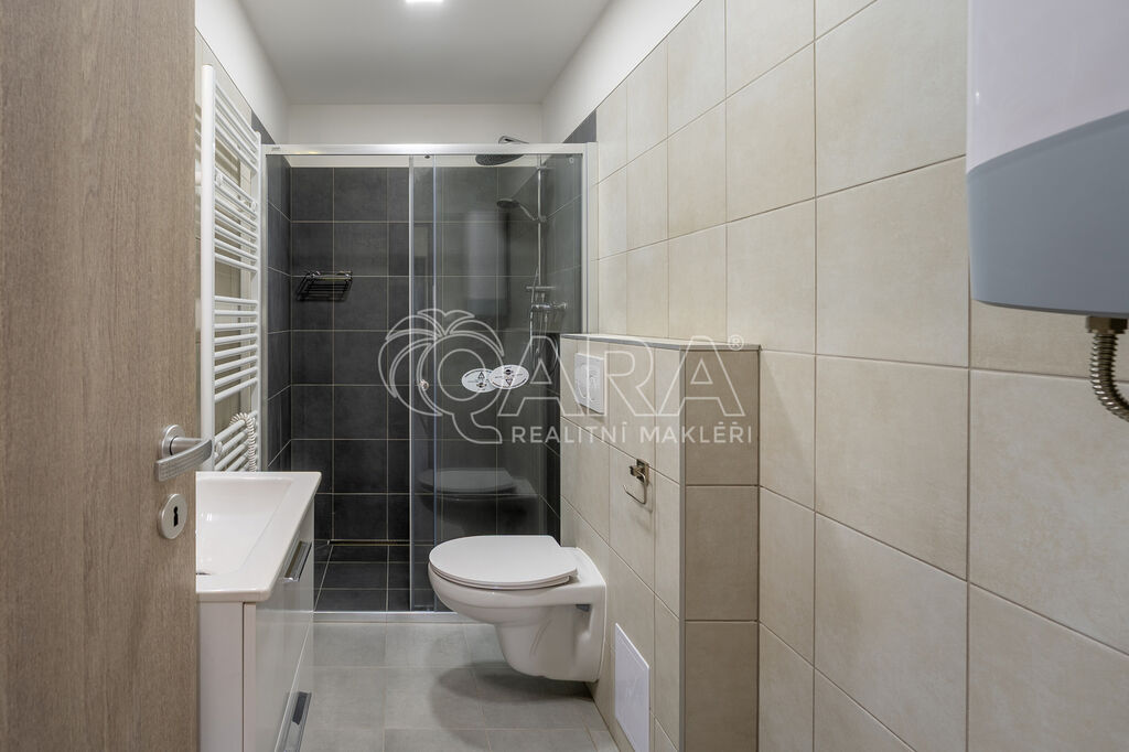 Ateliér o podlahové ploše 33,35 m² se nachází v 1. nadzemním podlaží (přízemí) cihlového domu. Skládá se ze zádveří o výměře 4,7 m², ze kterého vstoupíte do hlavní místnosti o výměře 24,1 m². Součástí je nová kuchyňská linka se spotřebiči (elektrickou troubou, varnou deskou, digestoří a lednicí s mrazákem a přípojkou na pračku). Ateliér je vhodný nejen k bydlení, ale i pro dočasné ubytování nebo komerční využití. Koupelna je vybavena prostorným sprchovým koutem, umyvadlem se skříňkou, zrcadlem a WC.