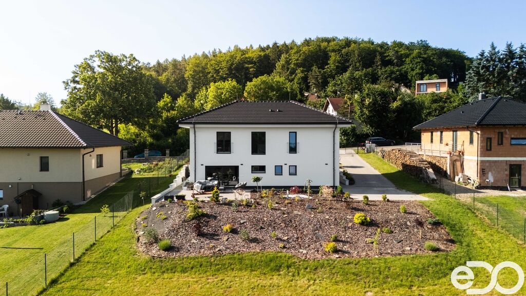 Dům je nízkoenergetický, vytápěný tepelným čerpadlem, s podlahovým topením, rekuperací a elektrickými roletami. Dispozice nabídne prostorný obývací pokoj s výstupem na terasu s krásným výhledem, kuchyňský kout, ložnici, tři další pokoje, koupelnu i technické zázemí. Zahrada má dost místa na bazén, pěstování i rodinné aktivity.