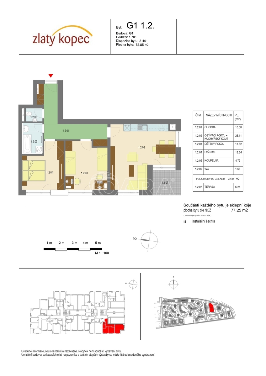 Nabízíme na prodej prostorný byt 3+kk s velkou předzahrádkou, který se nachází v projektu Zlatý kopec, novostavba z roku 2025. Bytový projekt s moderními prvky a kvalitním vybavením je umístěn v těsné blízkostí s pražskou čtvrti Vinoř a má vynikající dopravní spojeni s Prahou. Podlahová plocha bytu 77,25 m2 + terasa 5,24 m2 + předzahrádka 79 m2. V ceně bytu je sklep a parkovací stání v suterénu domu. Orientace bytu je na západ. Veřejnou dopravu pro obec obsluhují celkově tři linky MHD. Zastávka autobusu je umístěna přímo u bytového projektu. Přímé spojení do stanice metra Letňany, Palmovka a Prosek, kde se dostanete za 15 min. Cesta autem do stanice metra Letňany trvá ca 10 minut. Obec Přezletice s širokou občanskou vybavenost nabízí svými obyvatelům pohodlné bydlení v blízkosti hlavního města.