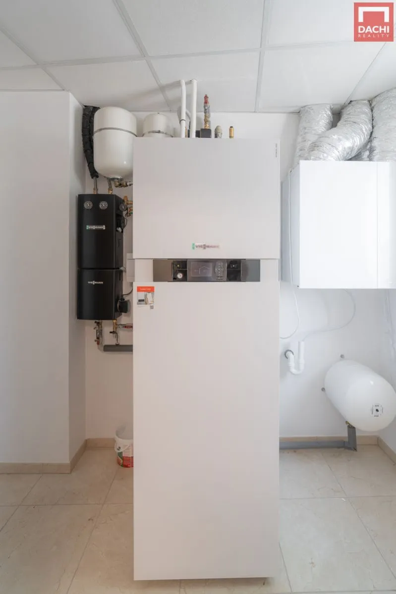 Technická místnost s přípojkami na pračku a sušičku, kde jsou umístěny moderní technologie: tepelné čerpadlo Vitocal 222S, solární termický systém Vitosol 300 TM a vzduchotechnická jednotka Vitovent 300W