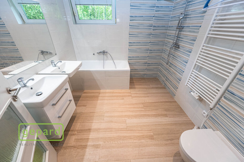Přízemí: do domu se vchází přes závětří se zámkovou dlažbou do zádveří, odkud je vstup do technické místnosti (WC, umyvadlo, kotel) a šatny se skříní, následuje chodba se vstupem do nově rekonstruované koupelny (sprcha, vana, WC, 2 umyvadla a žebříkový radiátor), do 2 pokojů (jeden z nich má vstup na zahradu) a do hlavní obytné místnosti, ze které se přes přístřešek se zámkovou dlažbou dostanete rovněž na zahradu, hlavní obytná místnost je zároveň propojena s kuchyní s jídelnou a ložnicí, ze které lze vyjít na zastřešenou terasu s dřevěnou prkennou podlahou. U domu se také nachází přístřešek na 1 auto.