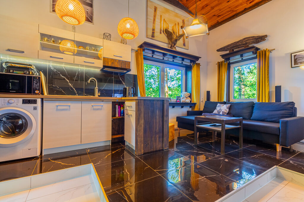 V přízemí se nachází koupelna se sprchovým koutem spojená s WC, technická místnost kde se nachází bojler, kuchyně je propojena s obývacím pokojem s krbem. V patře je ložnice a menší pokoj s další postelí a velká prosklená veranda. Chata má podlahové vytápění, kamerový systém, který lze ovládat na dálku. Tato nemovitost je jako stvořená pro milovníky rybaření, cykloturistiky i rekreačních sportů.