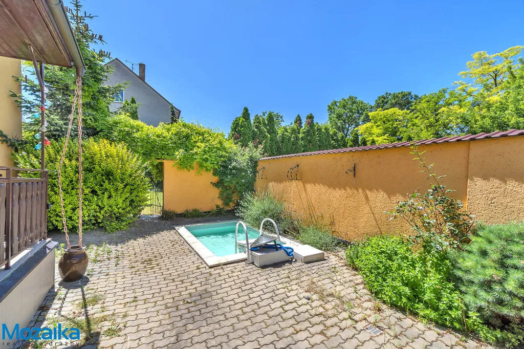 Za domem se nachází dlážděný dvorek s krytým posezením, králíkárnou a zapuštěným bazénem s pískovou filtrací (2 × 3 m, hloubka 80 cm). Odtud vstoupíte do dechberoucí zahrady, která je díky zdem a zeleným stěnám naprostým soukromým útočištěm.
