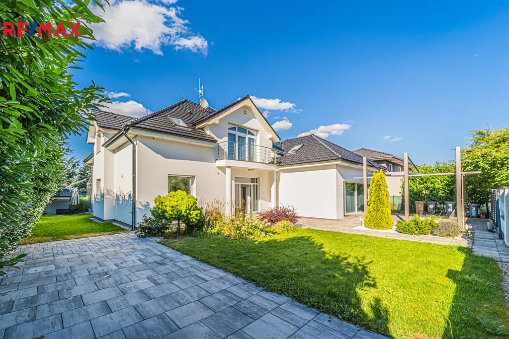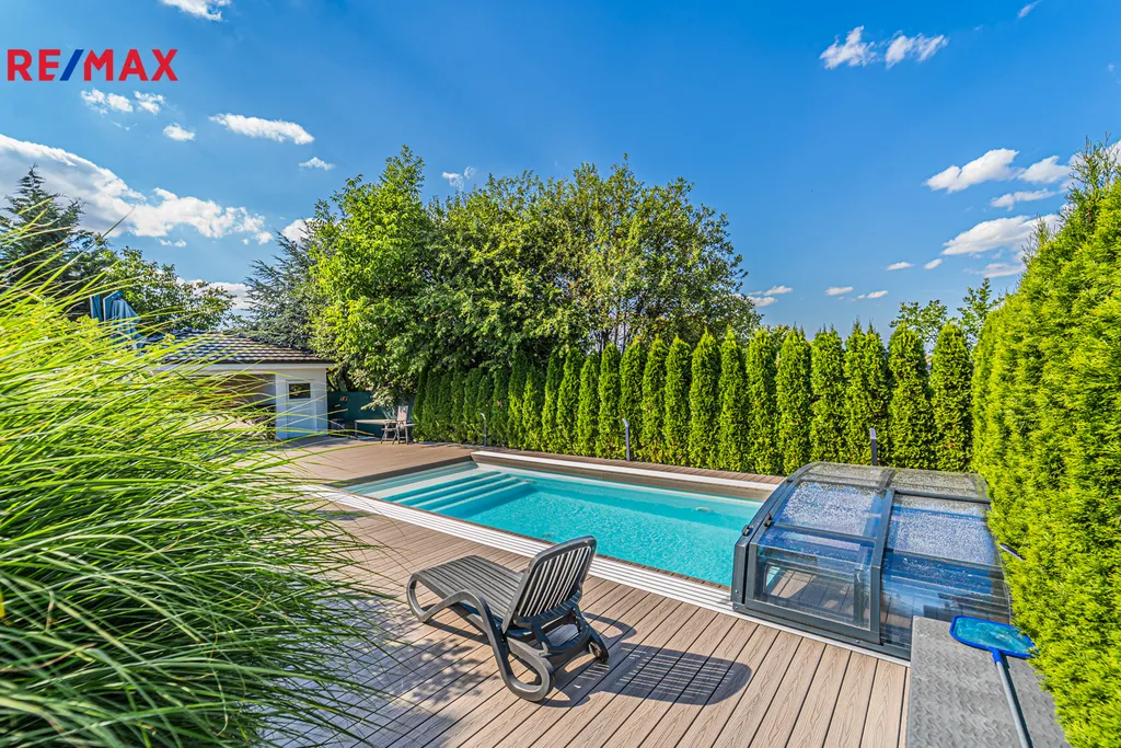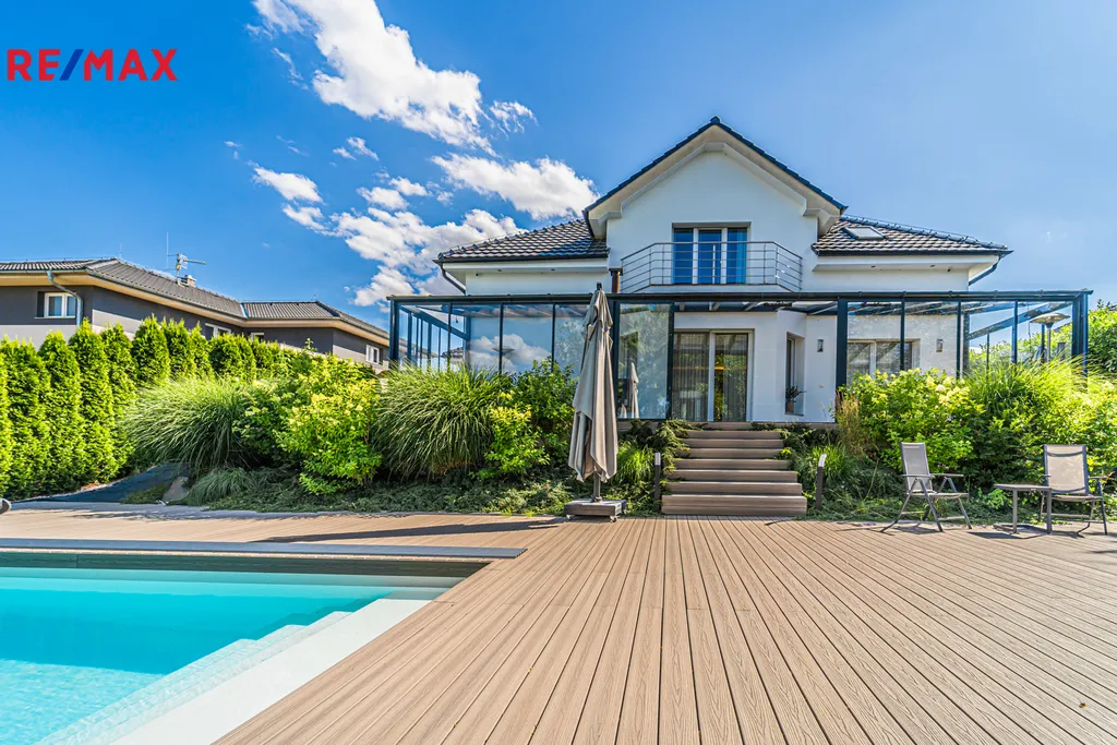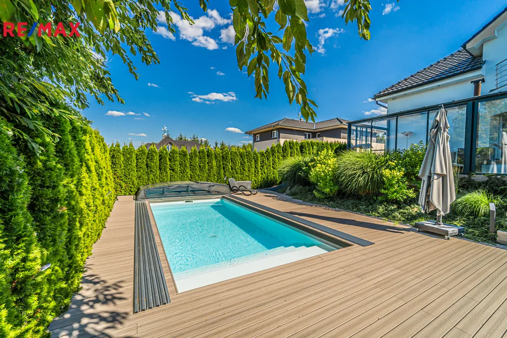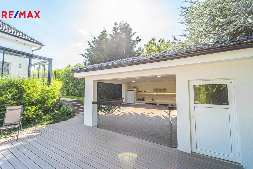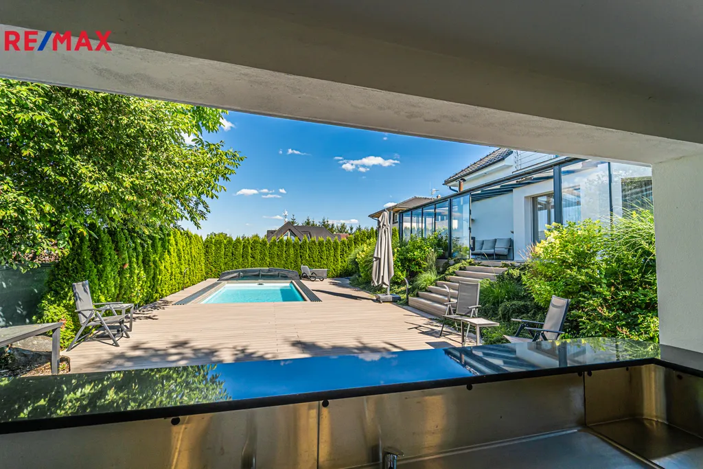 V letních dnech můžete relaxovat u vyhřívaného bazénu nebo si užít grilování v letní kuchyni s barovým pultem, lednicí a myčkou na nádobí. Na prostorné prosklené terase (45 m²) s krbem si zase vychutnáte večery i za chladnějšího počasí.