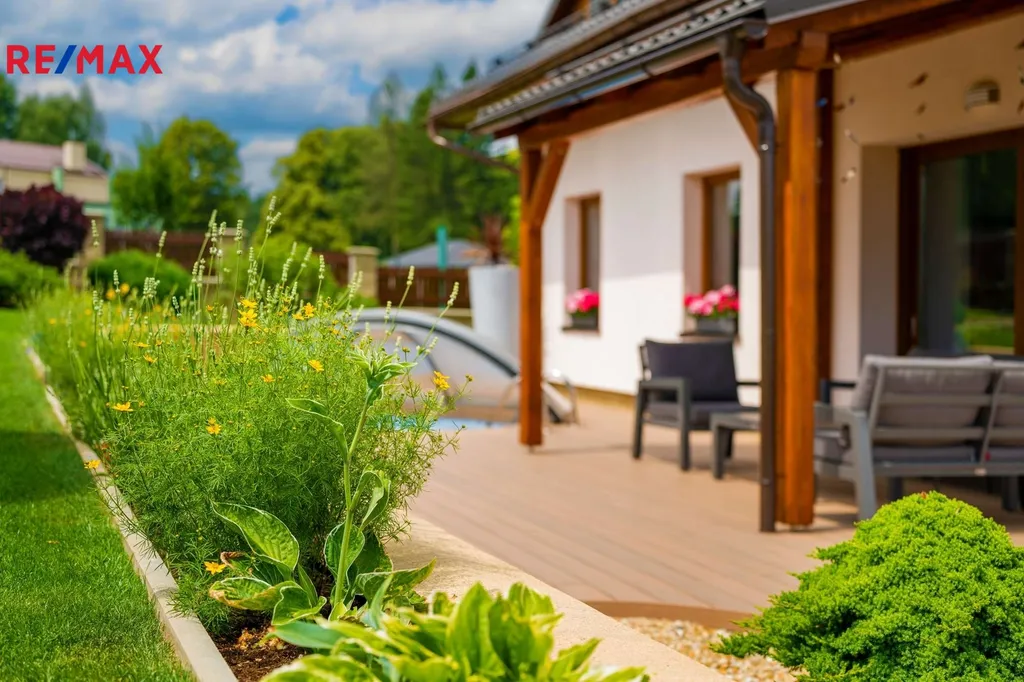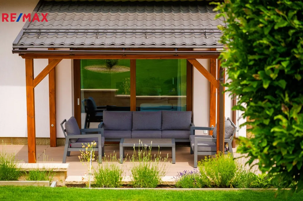 Zahrada nabízí nejen klid a pohodu pro relax, ale i samostatnou část se skleníkem pro pěstování rostlin a ovocných stromů, kde se můžete oddávat aktivnímu zahradničení. V zahradě je také zahradní domek se samostatným posezením a grilem. Pro Vaše vozy můžete využít kryté parkovací stání přímo u domu. Každý kout prostoru působí harmonicky – jako místo, kde se rádi zastavíte po dlouhém dni.