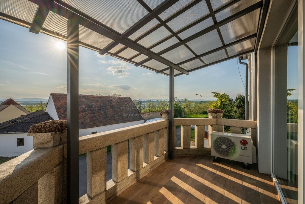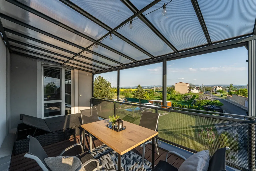 V horním patře se nachází centrální chodba, dva dětské pokoje, ložnice s přístupem na terasu a hlavní obytnou část, kterou tvoří prostorná kuchyně s jídelnou plynule navazující na obývací pokoj. Odtud je přímý vstup na obě terasy s nádhernými výhledy do okolí. Jednotka rovněž disponuje samostatnou toaletou, dvěma šatnami, koupelnou s dvojicí umyvadel a sprchovým koutem. K příjemným benefitům patří klimatizace a dostatek přirozeného světla díky skvělé orientaci domu.