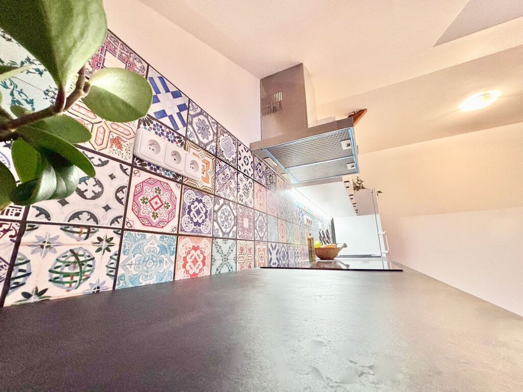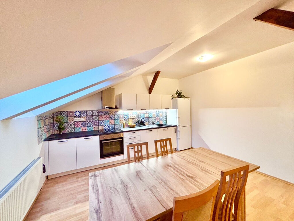 Jedná se o prostorný podkrovní byt. Byt se nabízí částečně vybavený, vybavení zůstává dle fotografií. V obývací části je kuchyňská linka s lednicí, troubou, varnou deskou, myčkou a digestoří, dále jídelní stůl se židlemi. V koupelně je rohová vana a umyvadlo. Toaleta je samostatně. V bytě jsou dvě klimatizační jednotky.