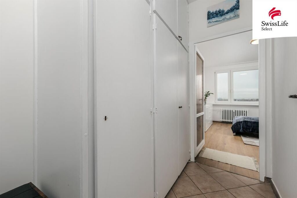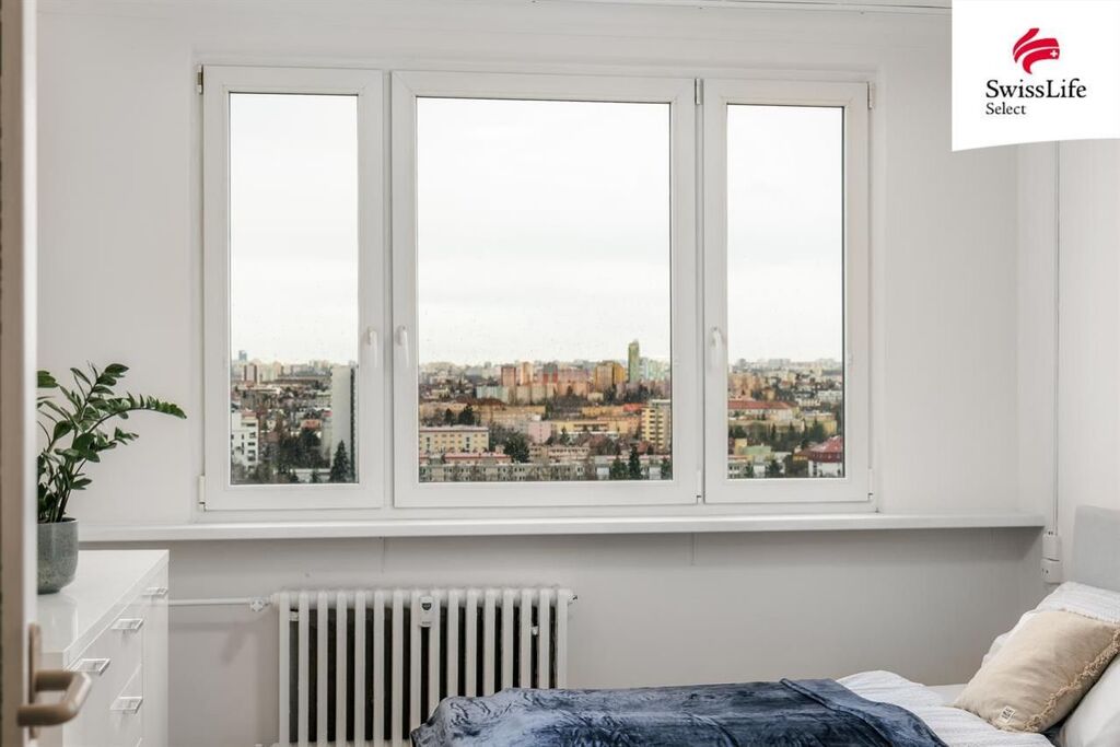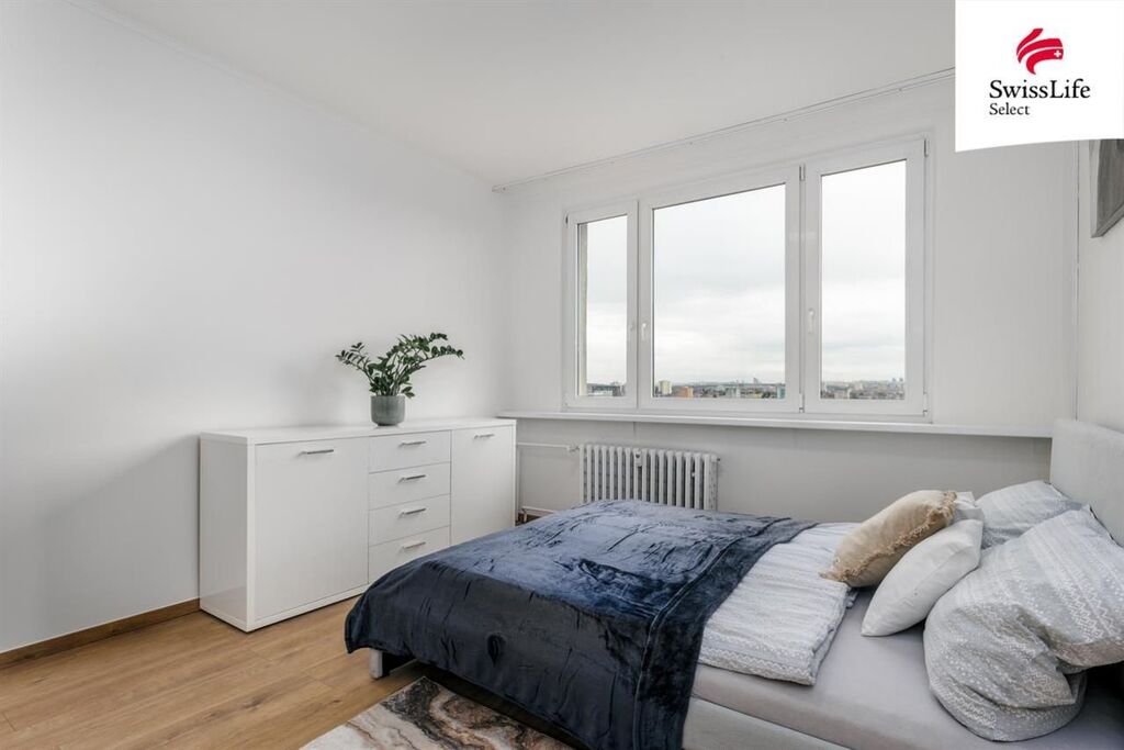 Praha 10 Strašnice, ulice Tuklatská, 13.patro revitalizovaného panelového domu s výtahem a zařízený byt 1+kk. Krásný výhled na široké okolí.