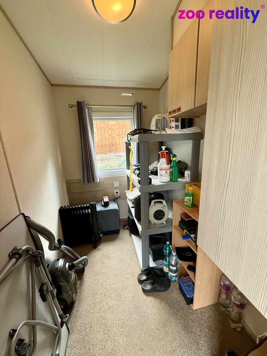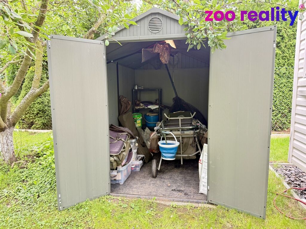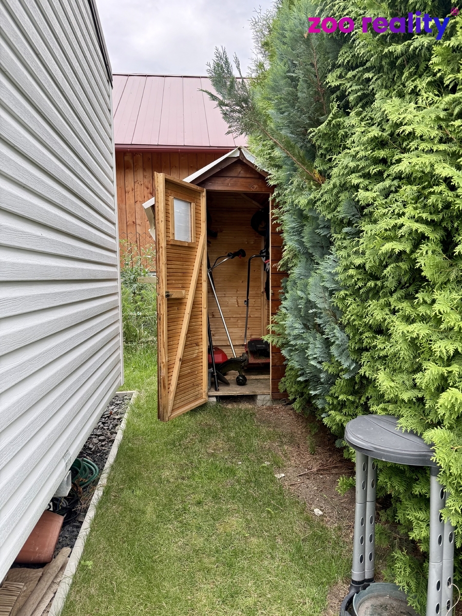Na pozemku je zahradní domek a malá dřevěná skříň na nářadí.  Parkování pro dvě auta.