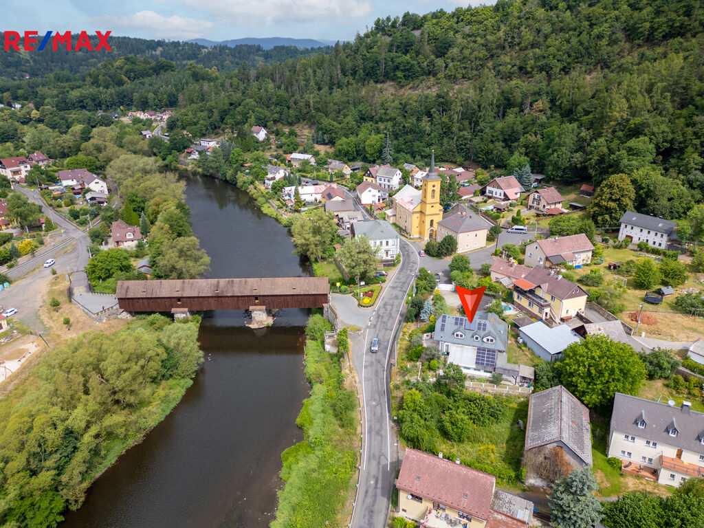 s výhledem na řeku Ohři i historický krytý most z 14. století v Radošově u Kyselky!