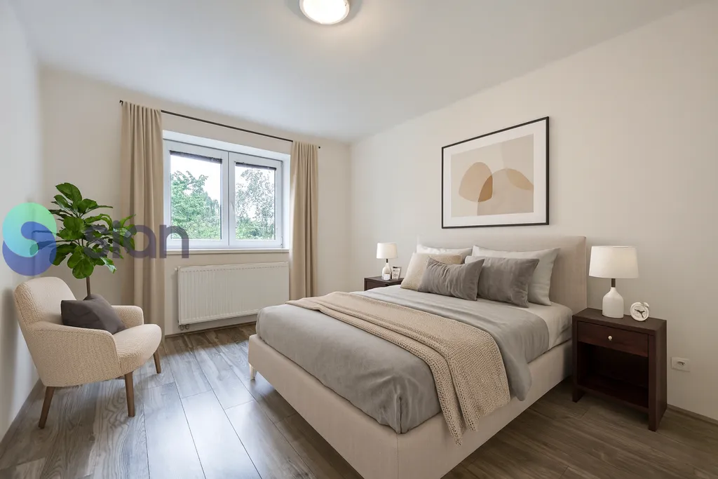Dispozice bytu: prostorná kuchyně je propojena širokým průchodem s obývacím pokojem, odkud francouzské okno vede přímo na lodžii. Druhý pokoj – ložnice – je neprůchozí. Koupelna je vybavena vanou, toaletou, topným žebříkem a plynovým kotlem, nechybí ani příprava na pračku. Mezi fotografiemi najdete i vizualizace, pro představu zařízeného bytu.