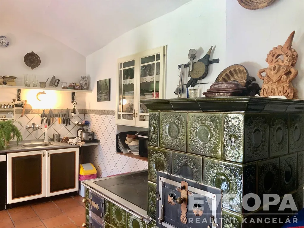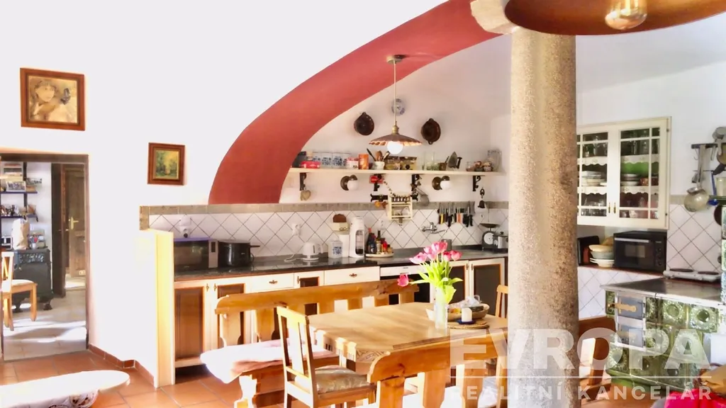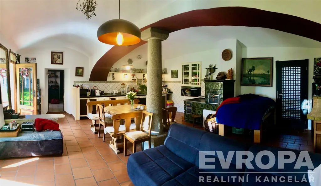 Dům je postaven ještě poctivou starou školou stavebních řemesel, díky čemuž nabízí podmínky, které jsou v moderním stavebnictví již raritou. Od roku 2015 je zcela opravena střecha a po celé ploše je nová krytina. Nabízí se útulný a inspirující prostor pro všechny, kdo preferují zdravé bydlení bez toxických stavebních materiálů. Tento starobylý kamenný dům s 1.2 m silnými zdmi je dobře postaven a možná pro někoho překvapivě je suchý a má dobré izolační vlastnosti, a to jak v létě, tak v zimě. Klenuté stropy ve všech prostorách domu, žulový sloup ve velké obývací kuchyni, špaldová dřevěná okna, různé výklenky, původní dveře z masivního dřeva a kachlová kamna dodávají domu svůj ojedinělý charakter. Kachlová kamna jsou nově postavena asi před dvaceti lety. Dům má další tři pokoje. Z přístupové chodby vede skladová komora s 200 l bojlerem, samostatná koupelna s rohovou vanou a umyvadlem, obložená uměleckou mozaikou a samostatné WC s ručně malovanou obkladovou dlažbou. Přímo z velké obývací kuchyně se lze dostat přímo ven dvěma vchody, severní vede přes pergolu do sadu, za kterým už je les a louka a jižní na kamenné zápraží.