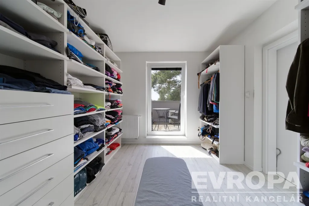 V druhém nadzemním podlaží je hlavní ložnice s vlastní koupelnou a šatnou, která se dá využít jako samostatný dětský pokoj. Z ložnice i z šatny je samostatný výstup na balkón nad terasou. Na patře dále najdeme hlavní koupelnu a pokoj.