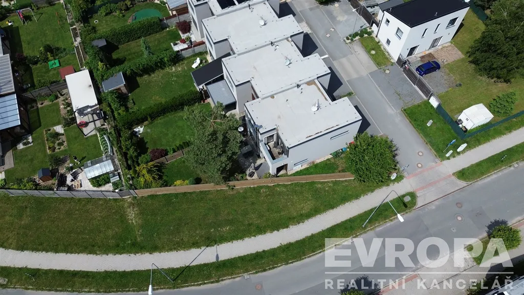 K domu náleží čtyři venkovní parkovací stání na vlastním pozemku přímo před domem. Dvě z nich je možné zastřešit pergolou.