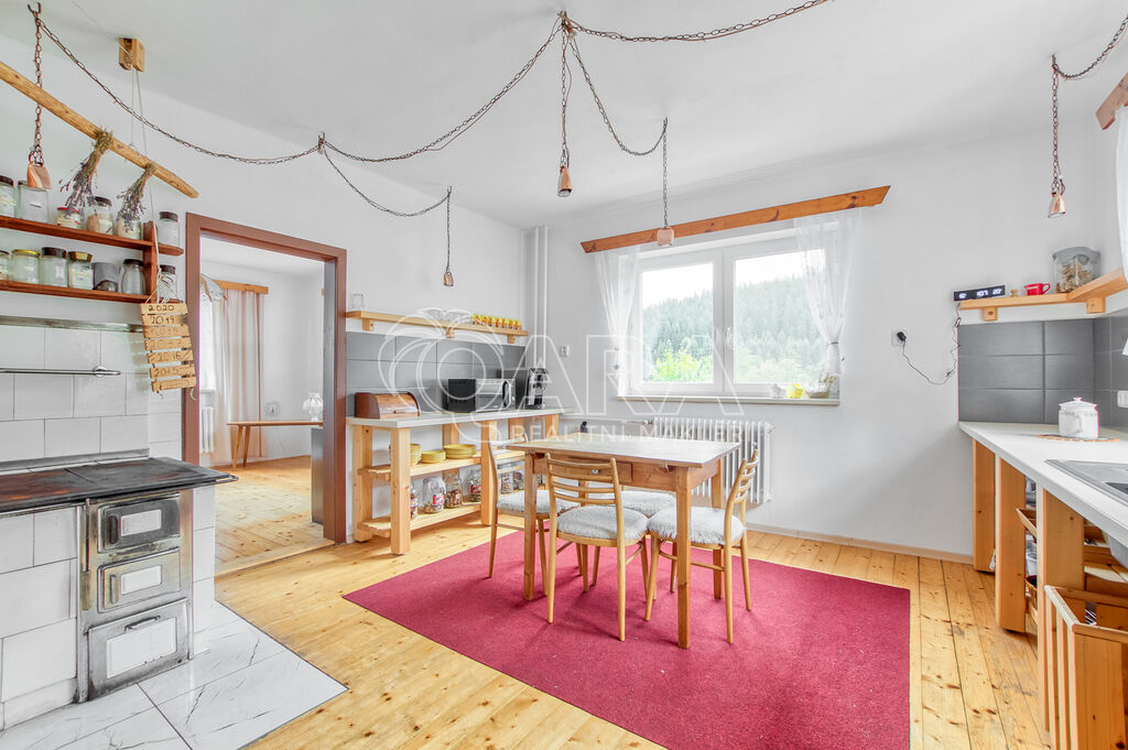 Interiér nabízí pět prostorných pokojů, kuchyni s jídelnou a moderní koupelnu. V pokojích jsou dřevěné palubky, v chodbě, koupelně a předsíni keramická dlažba. V kuchyni najdete původní, plně funkční kachlová kamna, která dodávají domu příjemnou atmosféru.