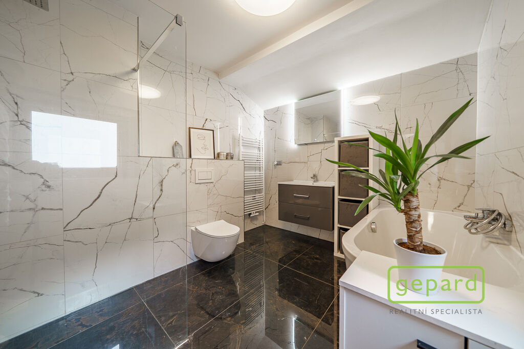 Byt prošel velmi zdařilou rekonstrukcí. V koupelně byla použita velkoformátová dlažba a obklady, příjemné je i podlahové topení v koupelně, které je v současné době zapojené na elektřinu ale je možné topení přepojit na jiný zdroj tepla.