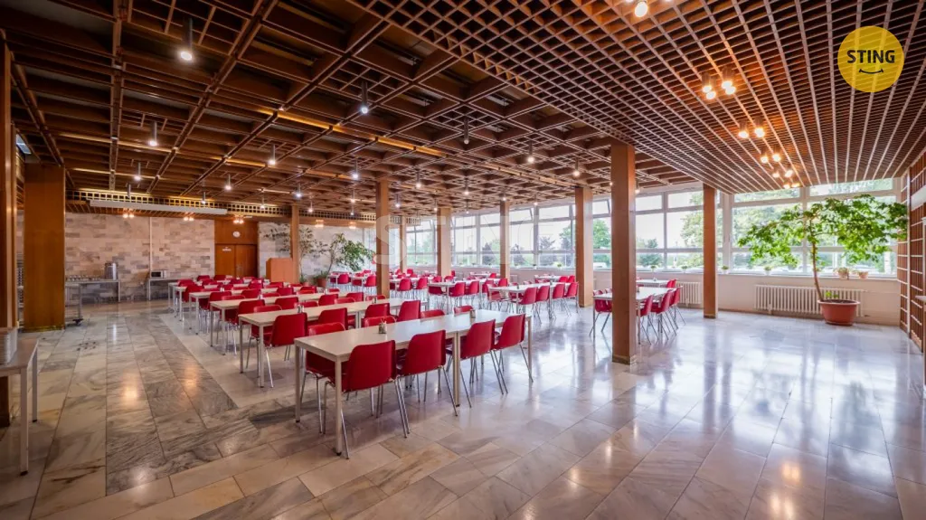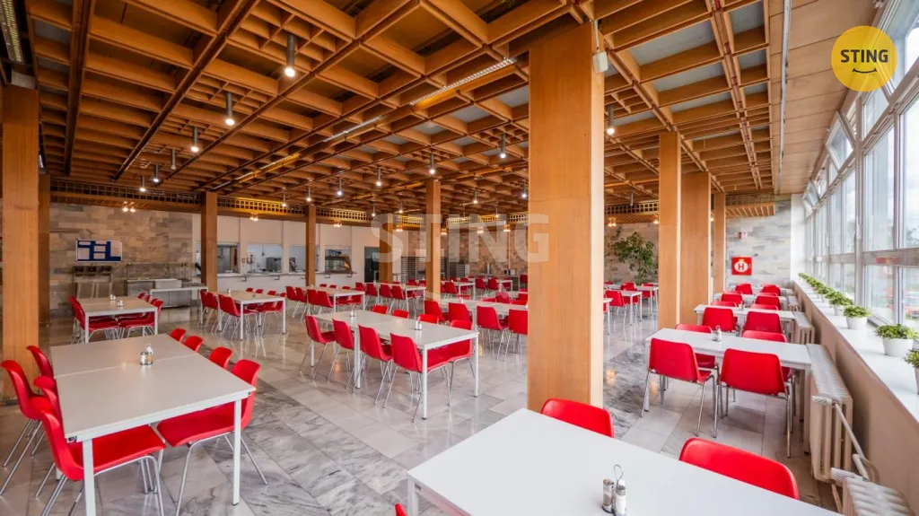 V suterénu (445 m²) se nachází sklepní prostory, archiv a kryt civilní obrany. Přízemí (1. NP, 616 m²) nabízí vstupní halu, ordinaci, bufet, jídelnu, plně vybavené kuchyně, prostory pro přípravu a skladování potravin, toalety a zázemí pro zaměstnance kuchyně. Ve vyšších patrech (2. NP – 402 m², 3. NP – 582 m², 4. NP – 544 m²) jsou k dispozici kanceláře různých velikostí, konferenční místnosti, toalety, šatny a menší kuchyňe pro zaměstnance.