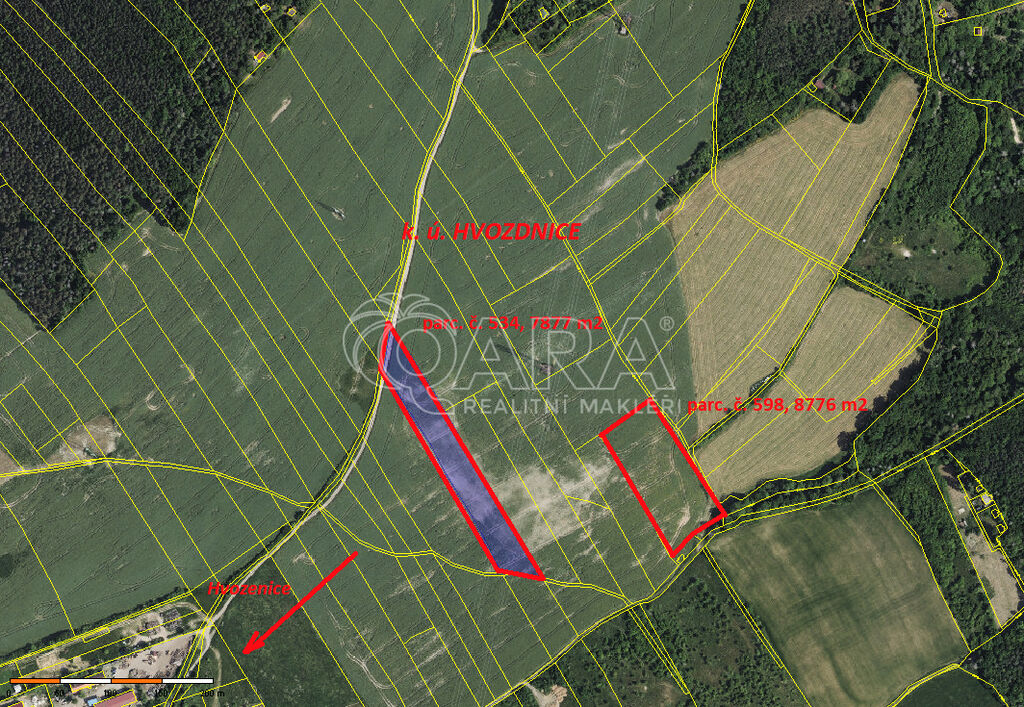 V exkluzivním zastoupení Vám nabízíme k prodeji soubor zemědělských pozemků v k.ú. Hvozdnice – parc. č. 534, orná půda (7877 m2), parc. č. 598 – orná půda (8776 m2) o celkové výměře 16 653 m2. Pole jsou aktuálně obhospodařována na základě pachtovní smlouvy s dvouletou výpovědní lhůtou. V případě Vašeho zájmu nebo pro doplňující informace prosím volejte nebo pište na níže uvedené kontakty.