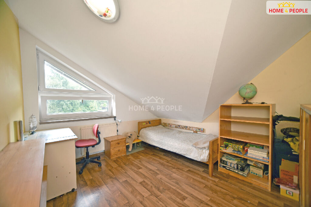Z chodbičky v druhém nadpodlaží je vstup do tří dětských pokojů. Galerie s nízkými vestavěnými skříněmi je využívána jako učebna s PC a hudební koutek s klávesami.