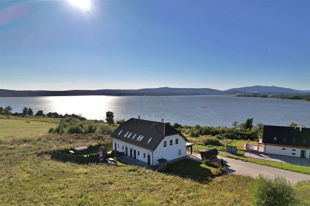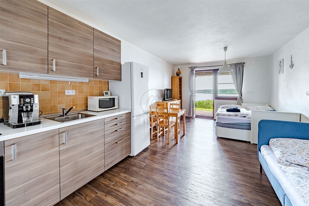 Jednotka o podlahové ploše 32m2 je promyšleně navržena a disponuje zádveřím s úložným prostorem, koupelnou s WC, dále obývacím pokojem s kuchyňským koutem a vstupem na luxusní terasu (15,6m2) s dechberoucím výhledem na širokou hladinu Lipna a západ slunce.