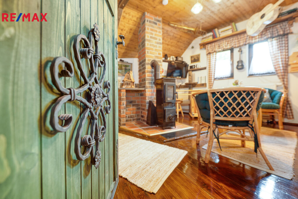Druhý vchod vede do chodby, z níž je přístup do koupelny, kuchyně, sklepa a na schodiště do horního patra. V patře se nachází druhá koupelna s toaletou, pokoj využívaný jako prodejna keramiky a prostorná ložnice s pracovním koutem.