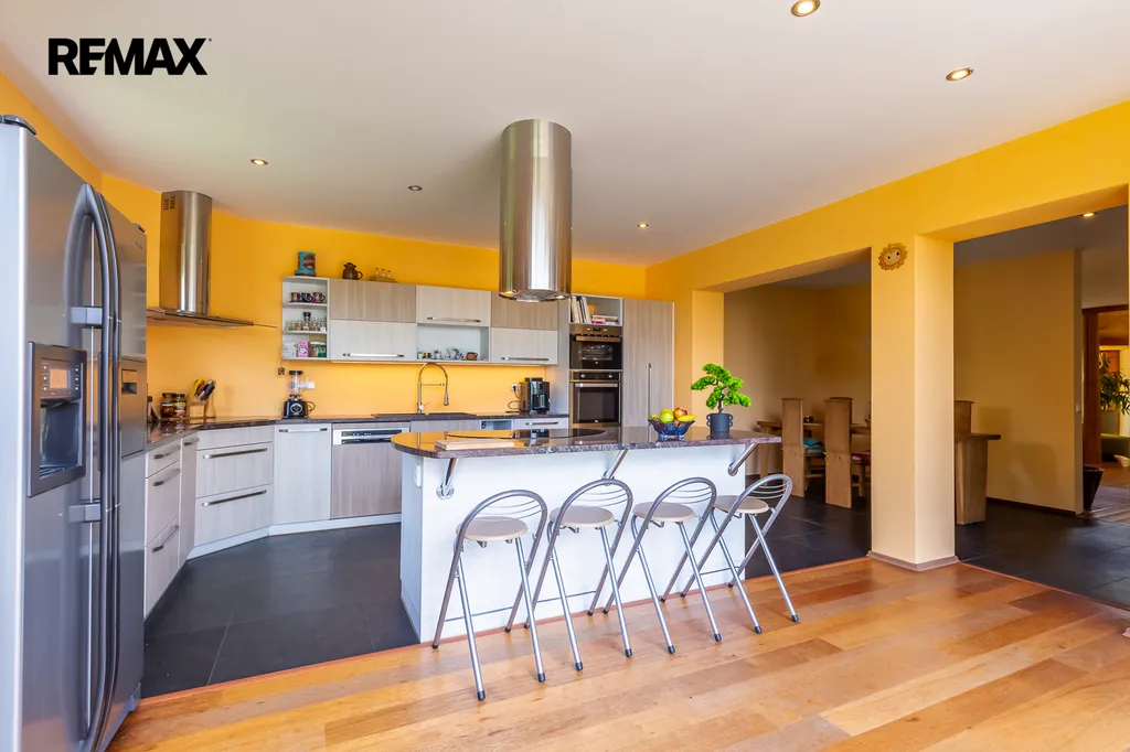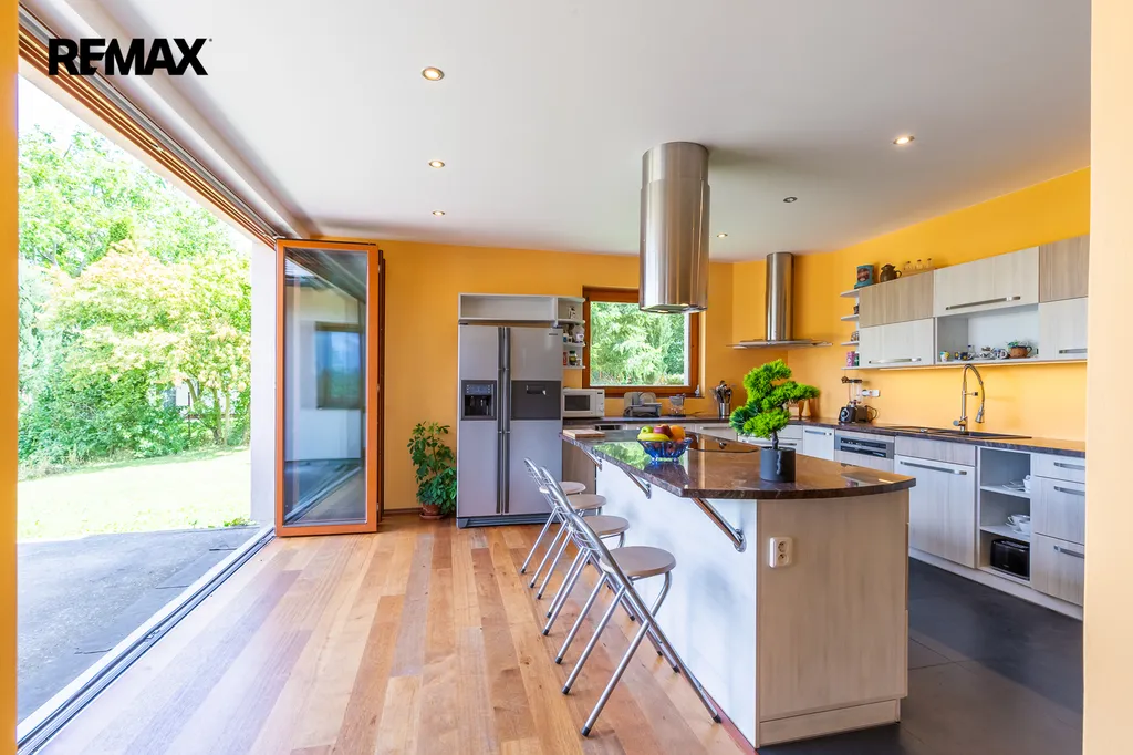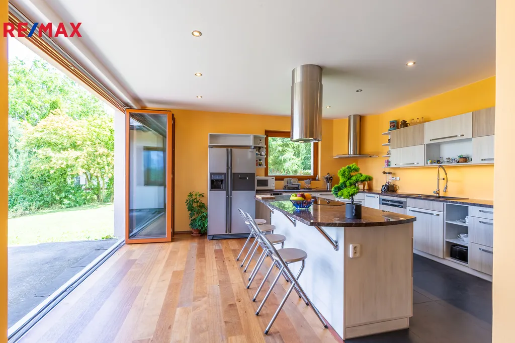 • Designová kuchyně s ostrůvkem, dostatkem úložného prostoru a vstupem na zahradu