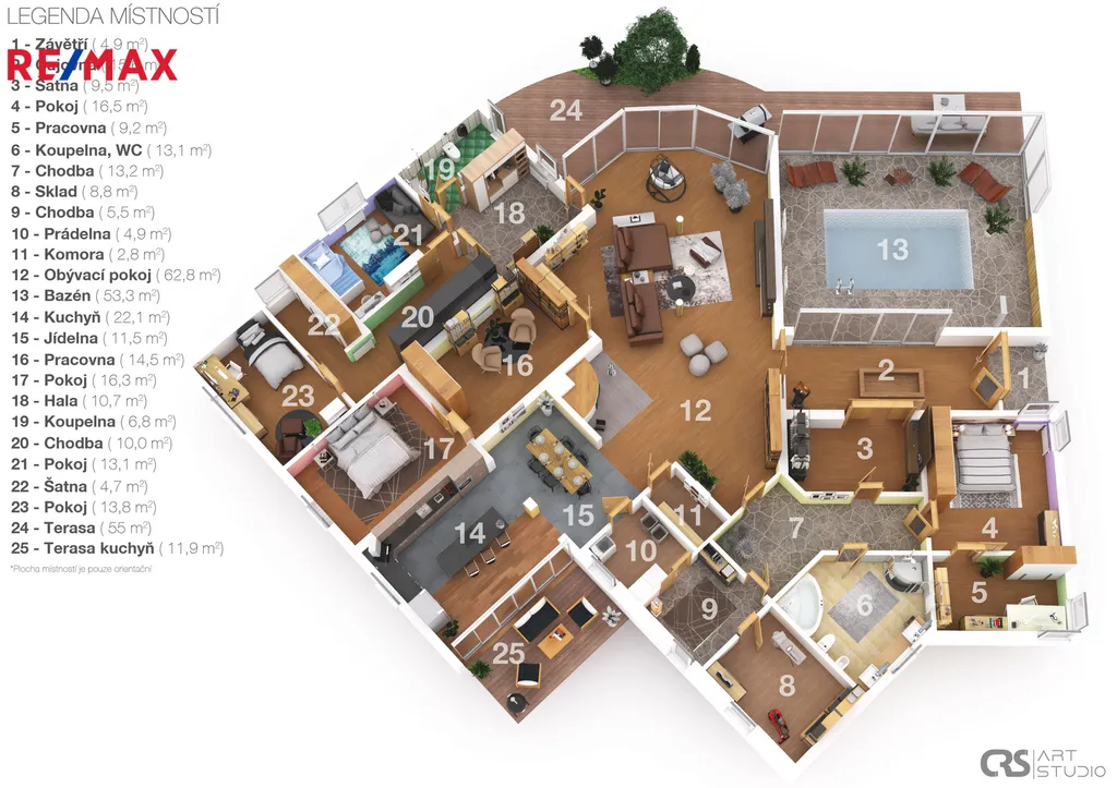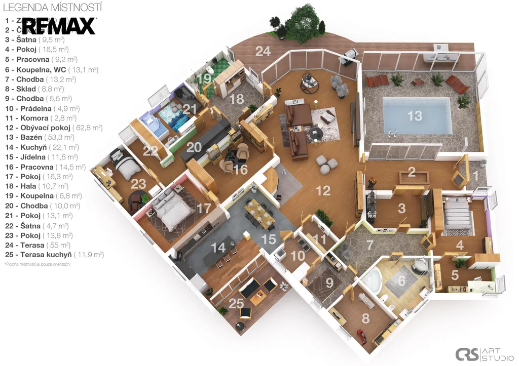 • Dispozice: 5+kk + 2 pracovny + 2 koupelny + 2 šatny + prádelna + sklad + úložné prostory