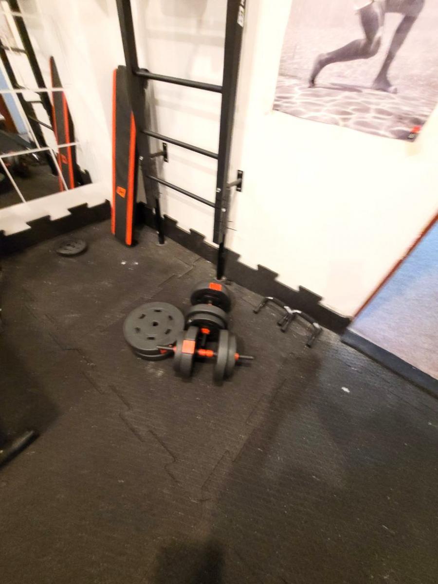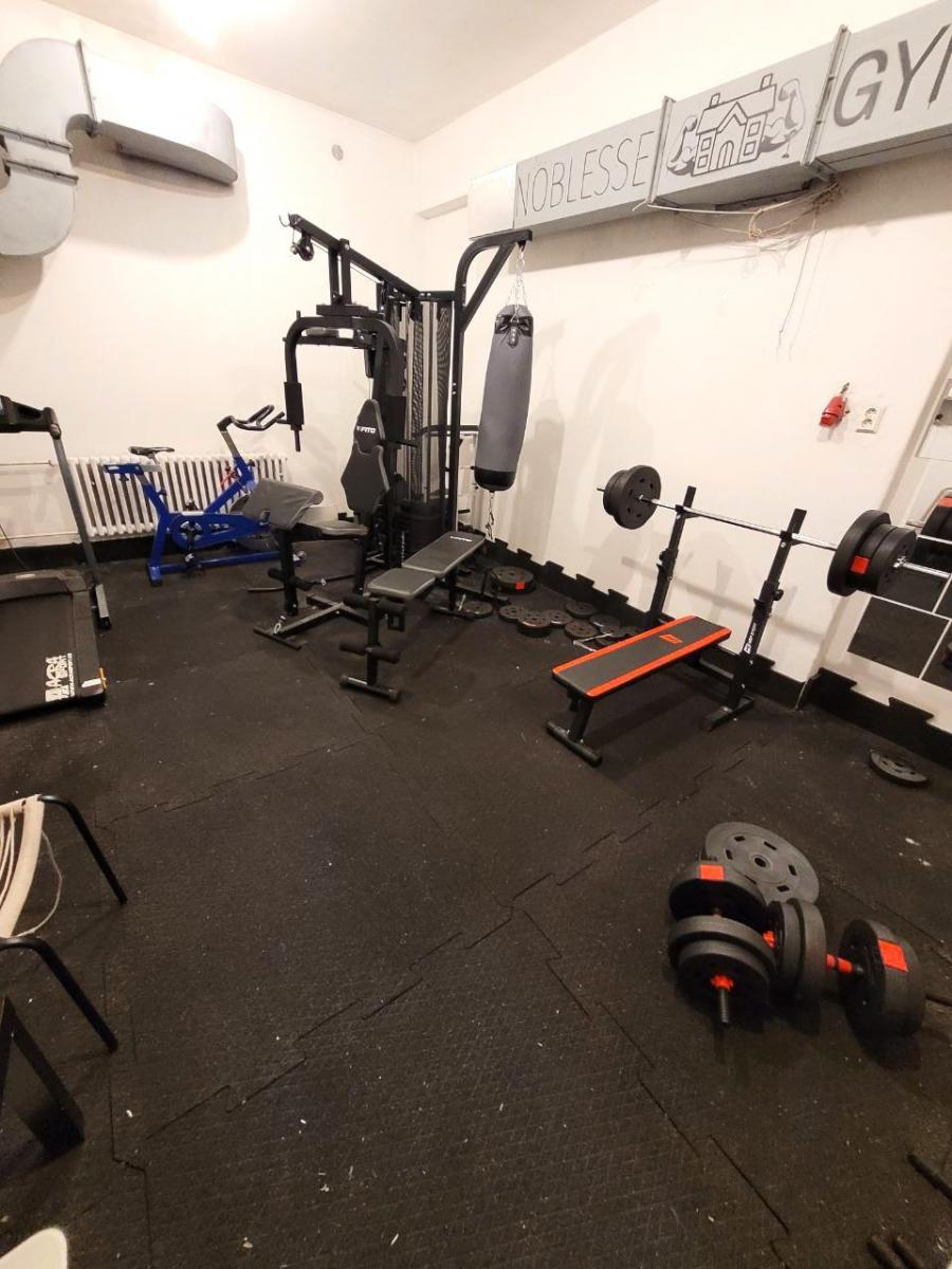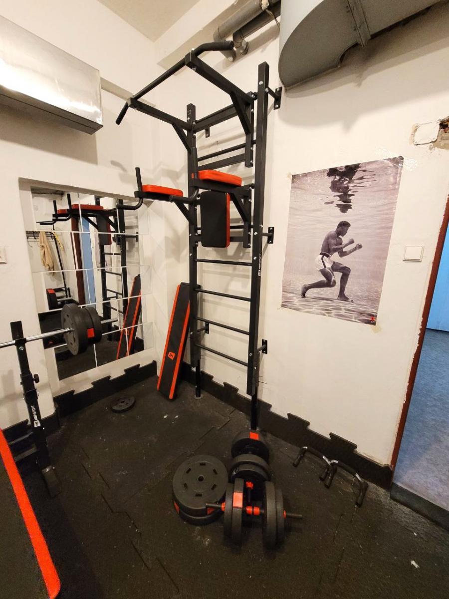 Součástí vybavení je běžecký pás, boxovací pytel, lavice na benchpress, bradla, multifunkční věž, švédská stěna a další.
