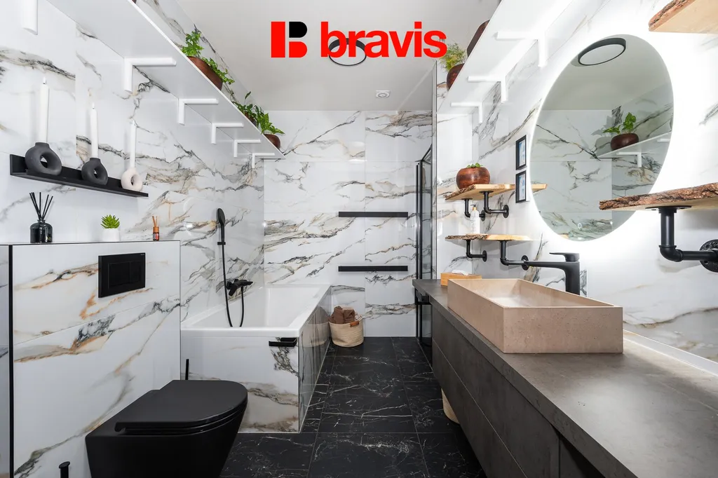 • Dvě koupelny a samostatné WC: Luxusní koupelny vybavené designovými prvky a velkoformátovými obklady vám poskytnou každodenní dávku komfortu.
