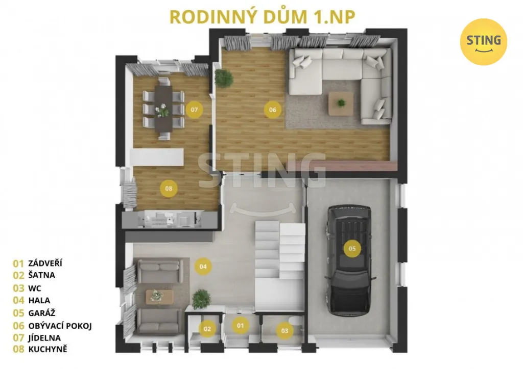 Velkorysý prostor: Tři podlaží, v přízemí vstupní hala, prostorný obývací pokoj, kuchyň s přímým vstupem na terasu, toaleta a garáž.